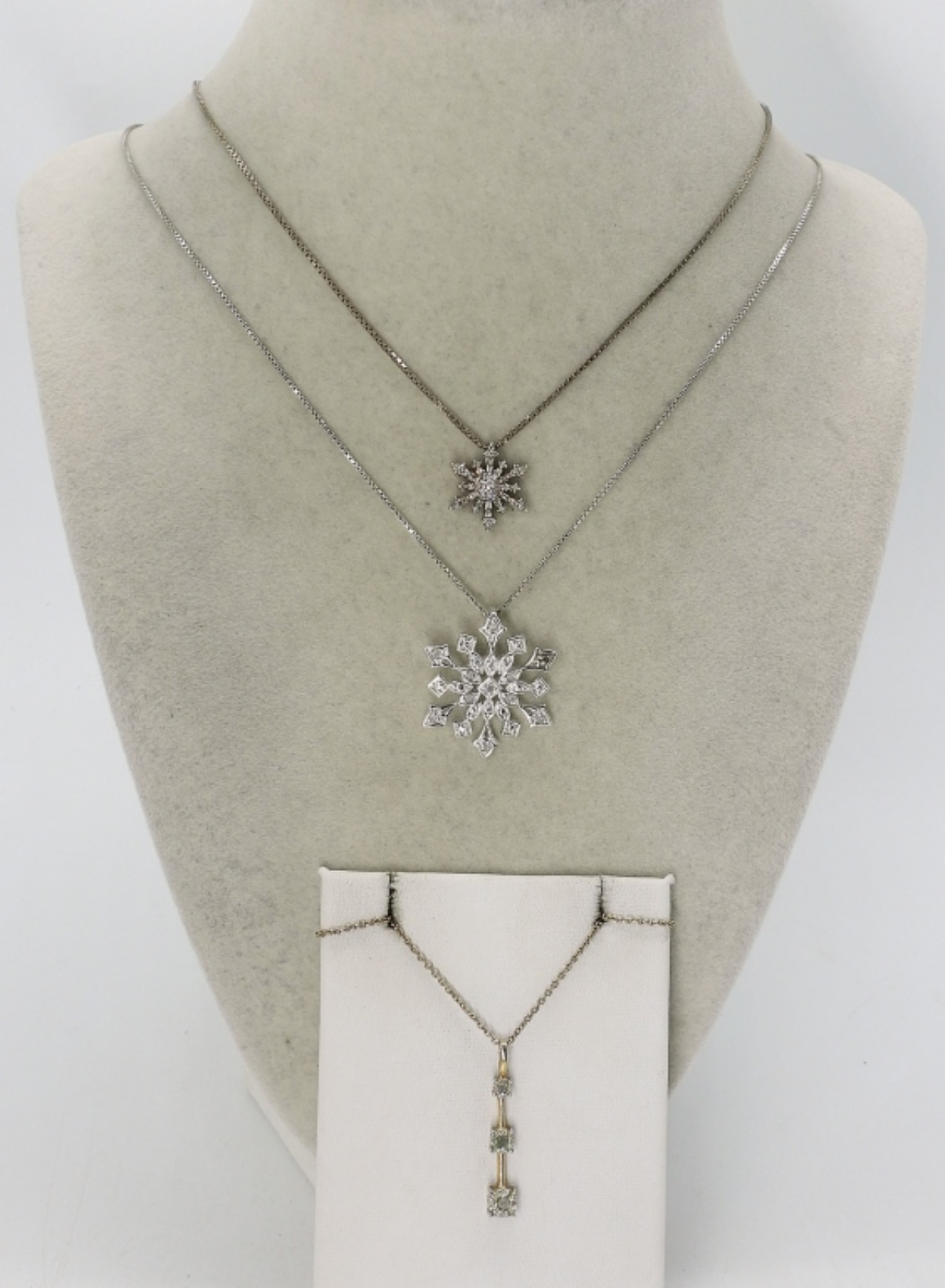 THREE STERLING NECKLACES, ALL WITH DIAMONDS & MOISSANITE GEMSTONES. 18″ & 24″ CHAINS. (7.7 DWT)