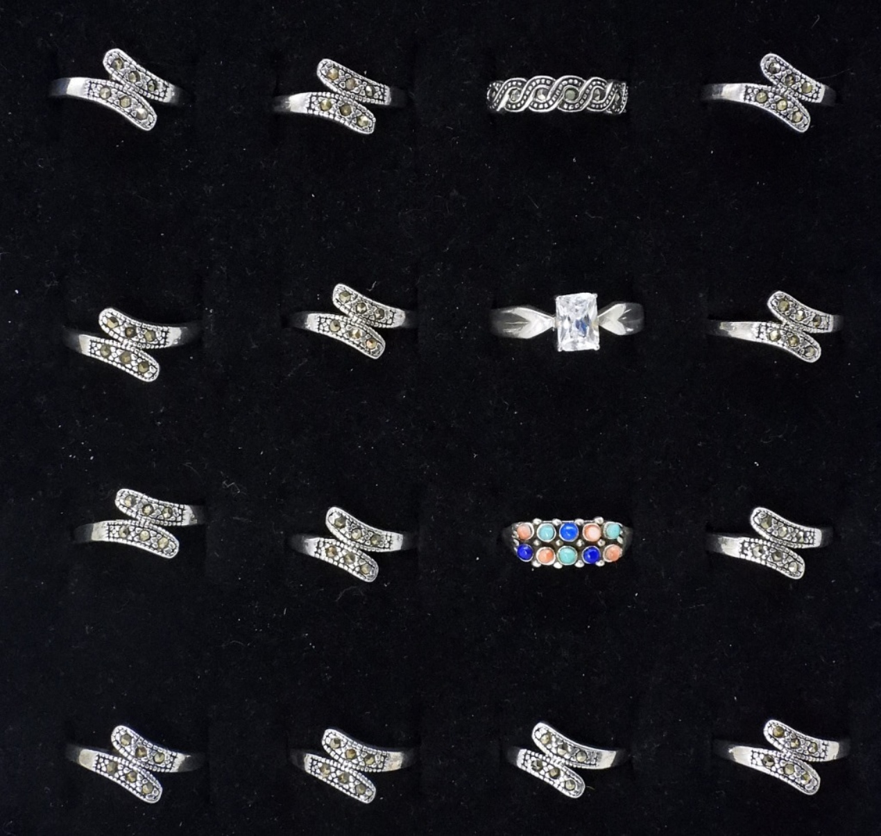 SIXTEEN STERLING MARCASITE & GEMSTONE FASHION RINGS. MULTIPLES OF EACH RING. SIZES 5.5-7 (32.4 DWT)