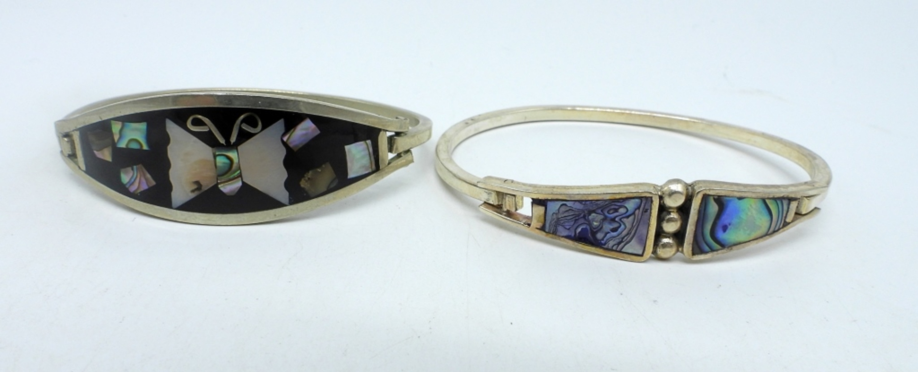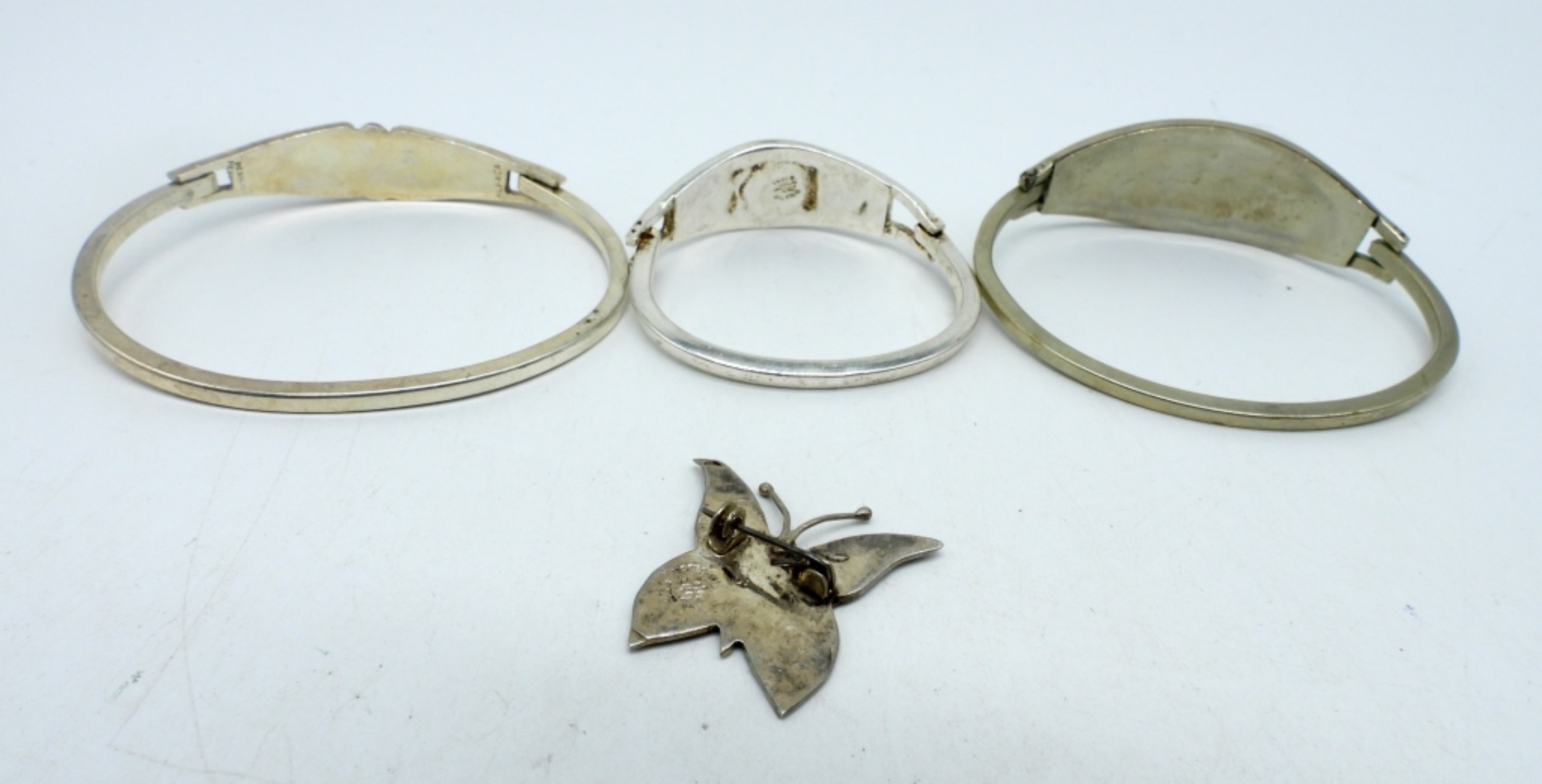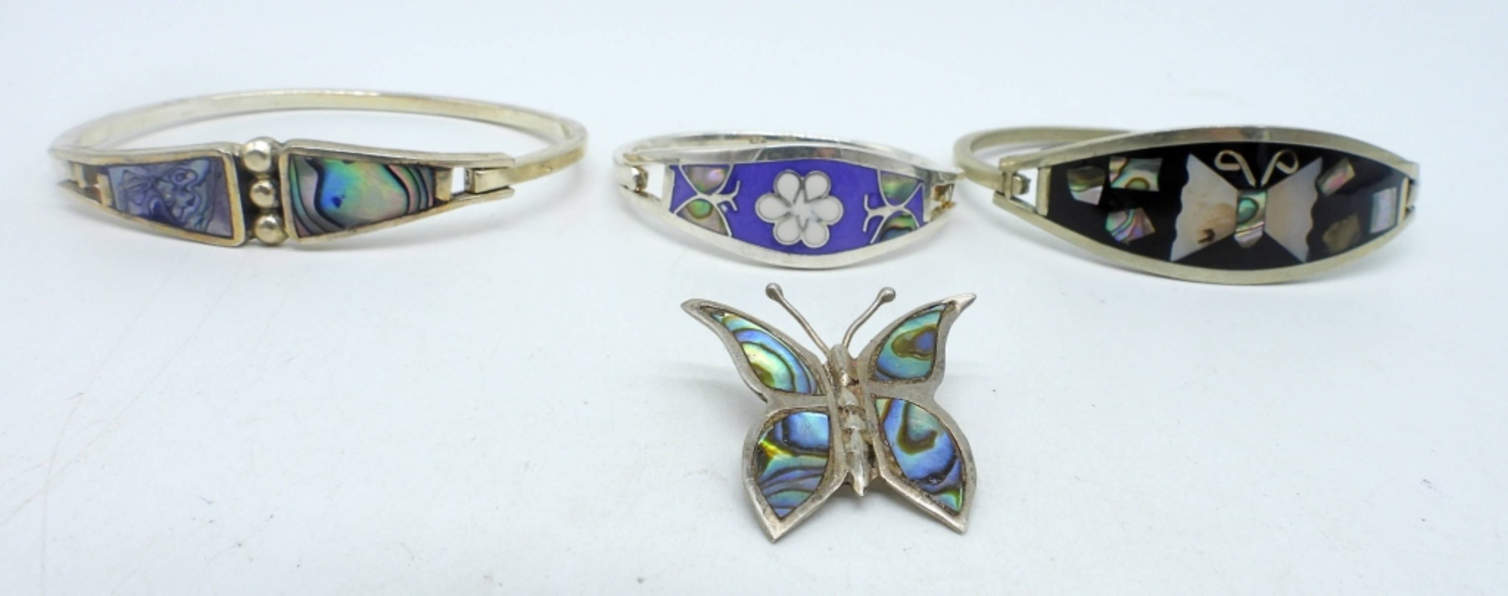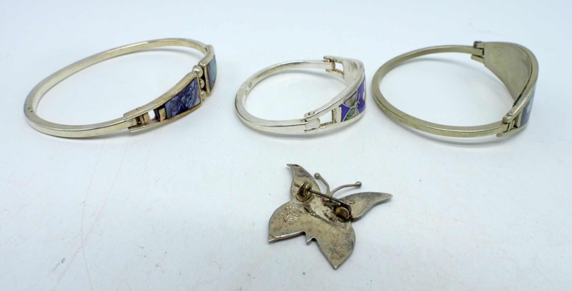 TAXCO 925 CHILD SIZED ABALONE INLAY HINGED BRACELET 5″. TWO ALPACA / MEXICO STERLING INLAY HINGED BRACELETS, 7″. MEXICO BUTTERFLY ABALONE INLAY PIN, 1″. (27.1 DWT)