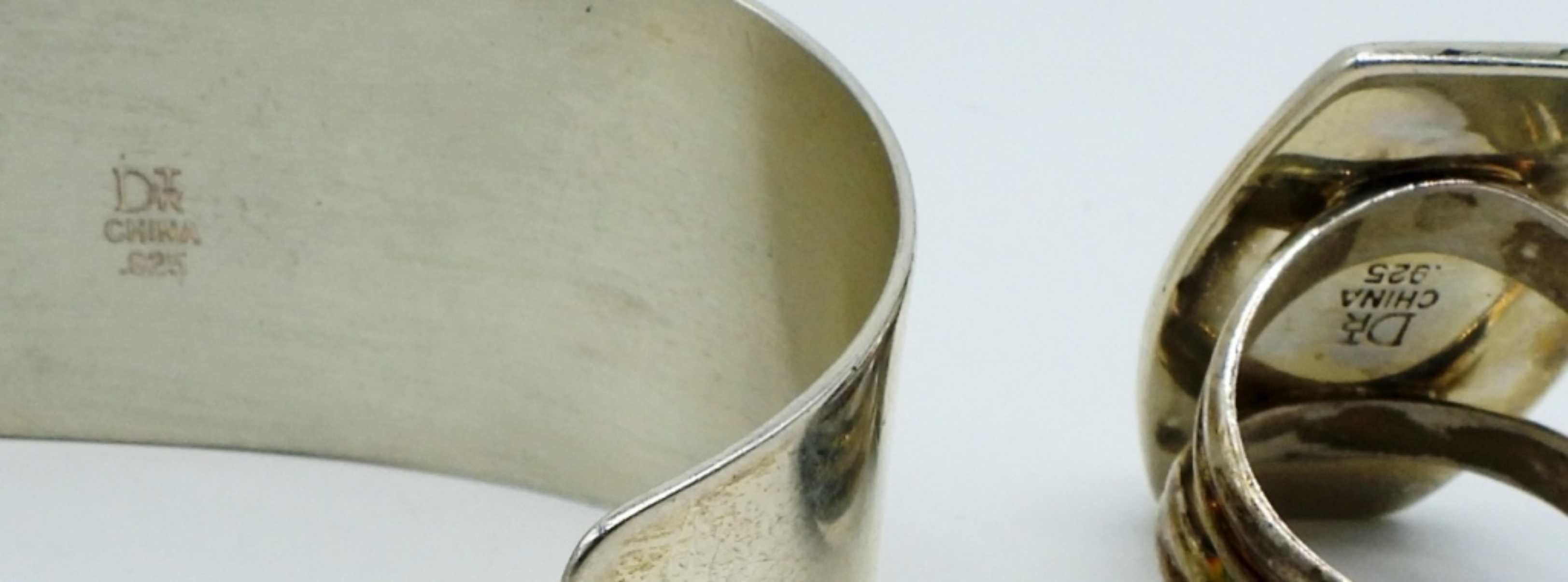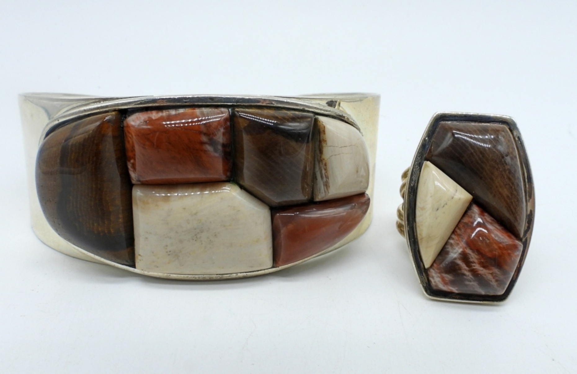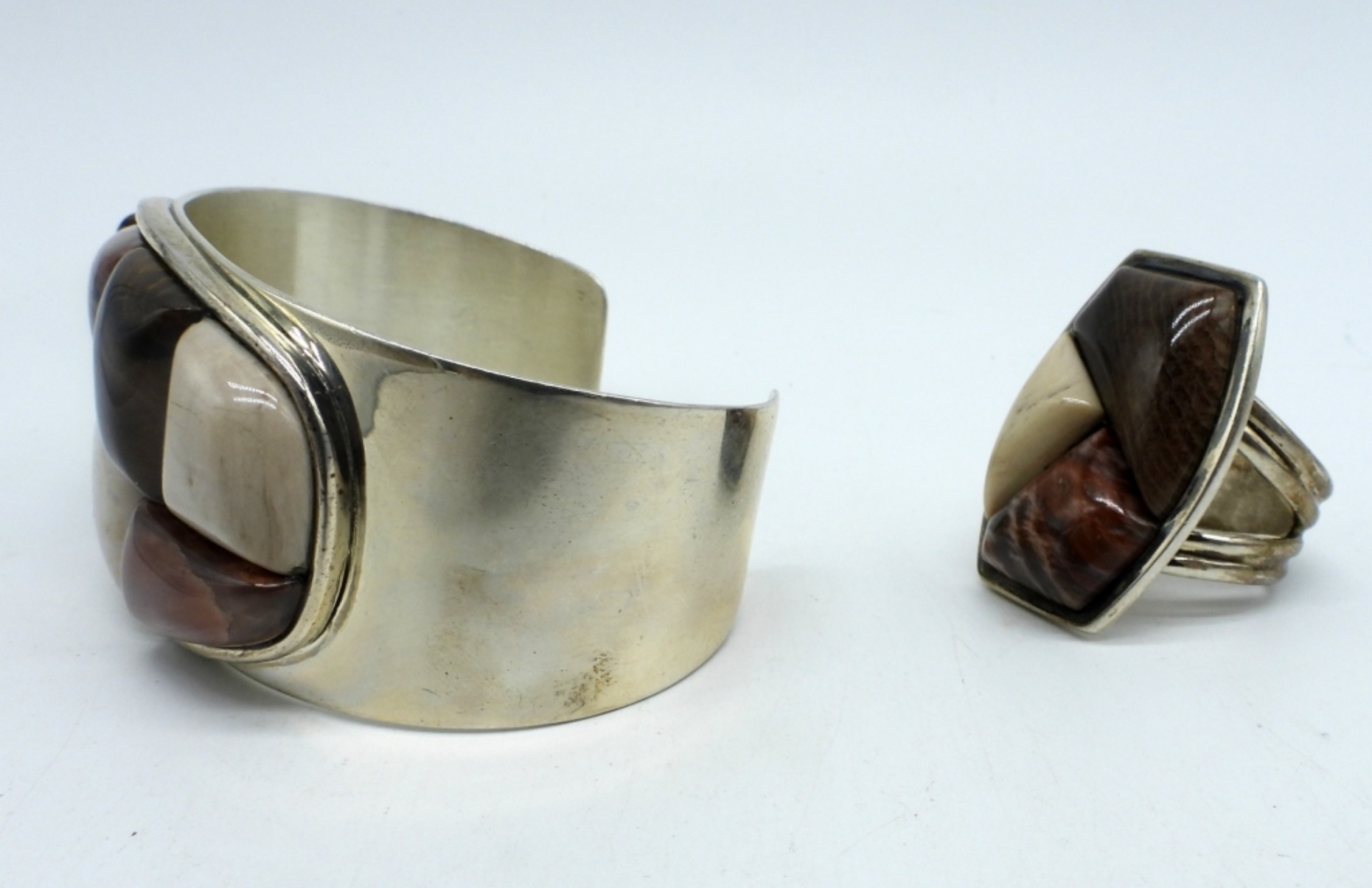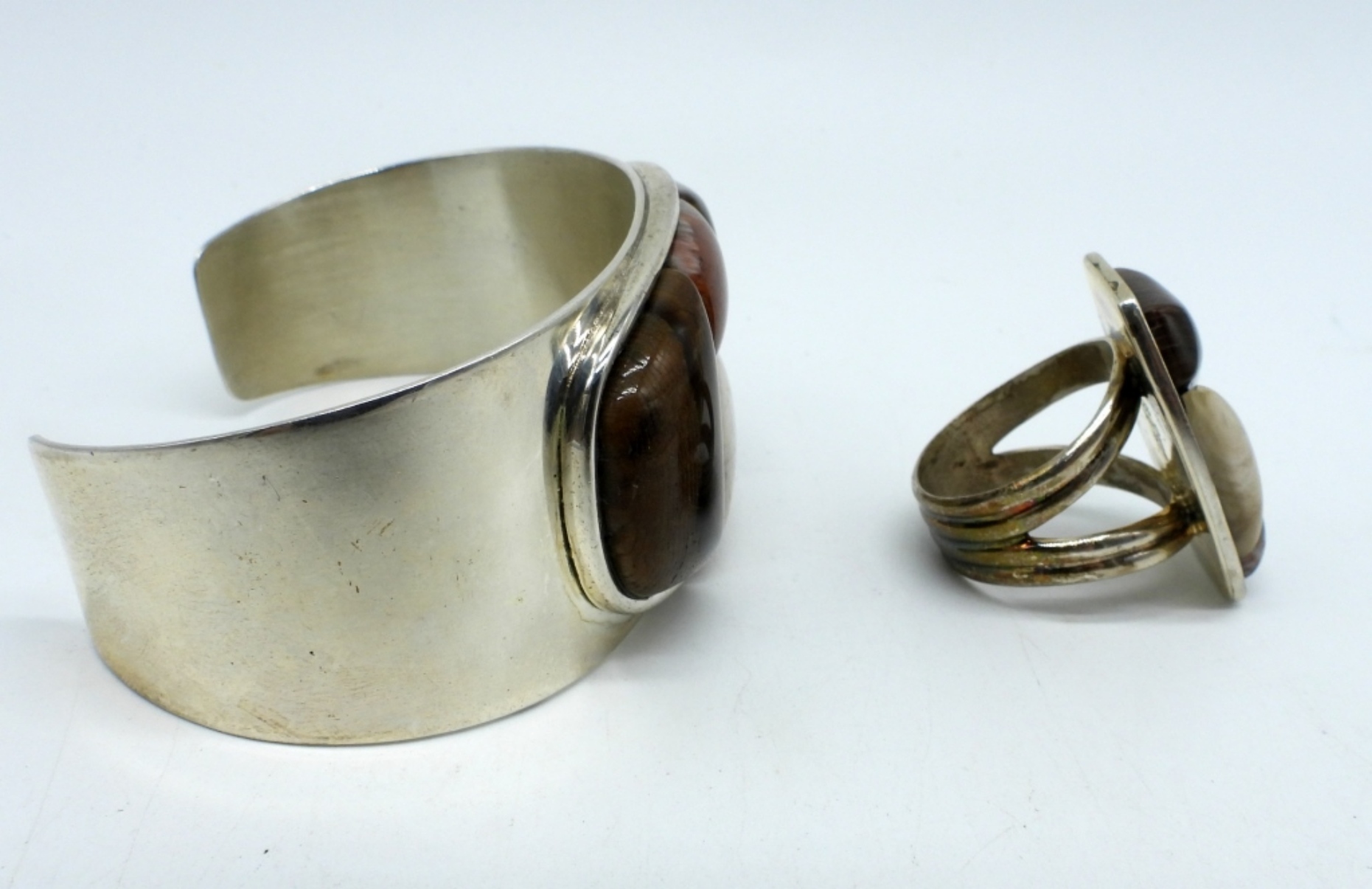 JAY KING “DTR CHINA 925” BROWN GEMSTONE CUFF BRACELET AND MATCHING RING (SIZE 10). (70 DWT)