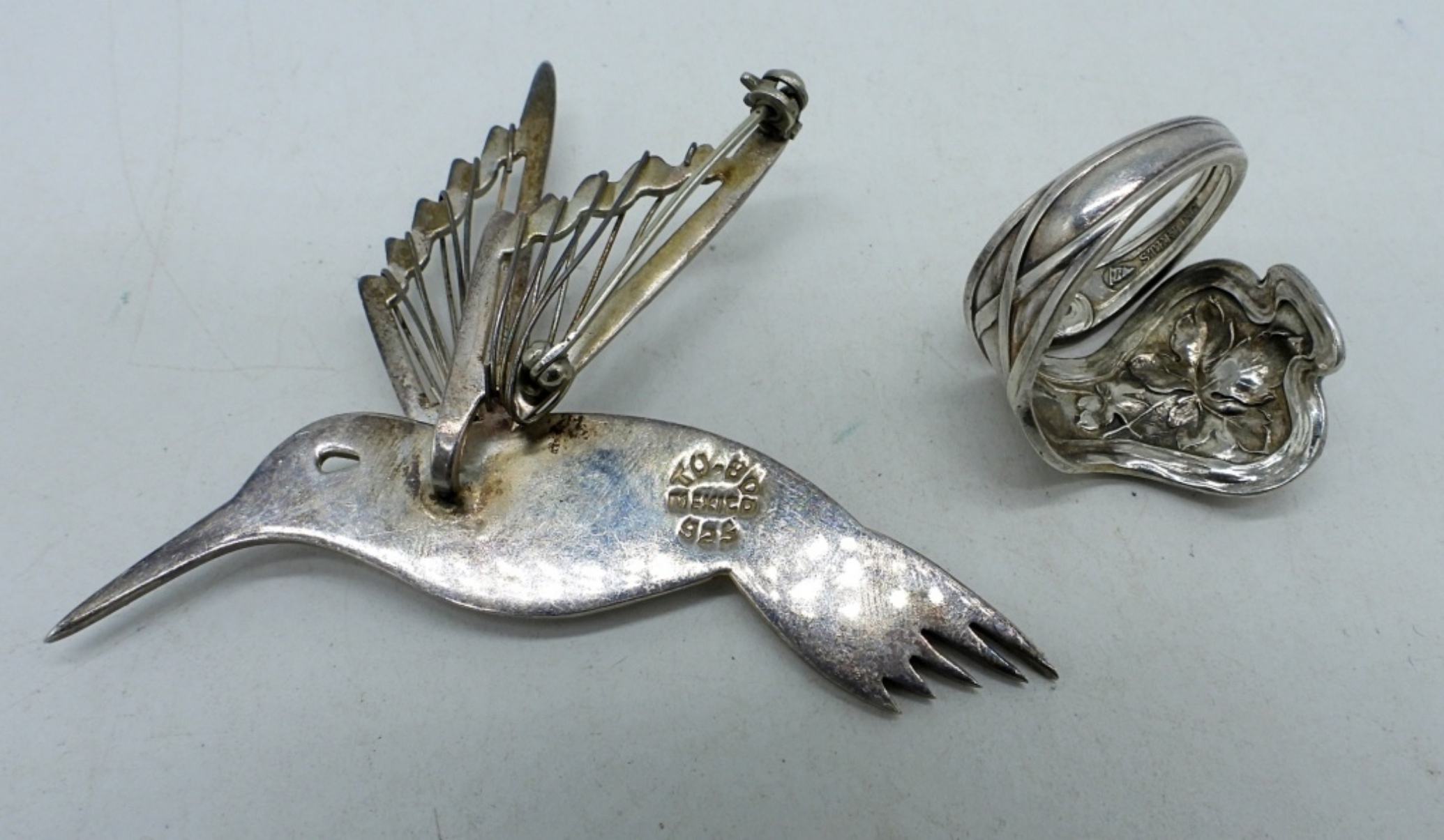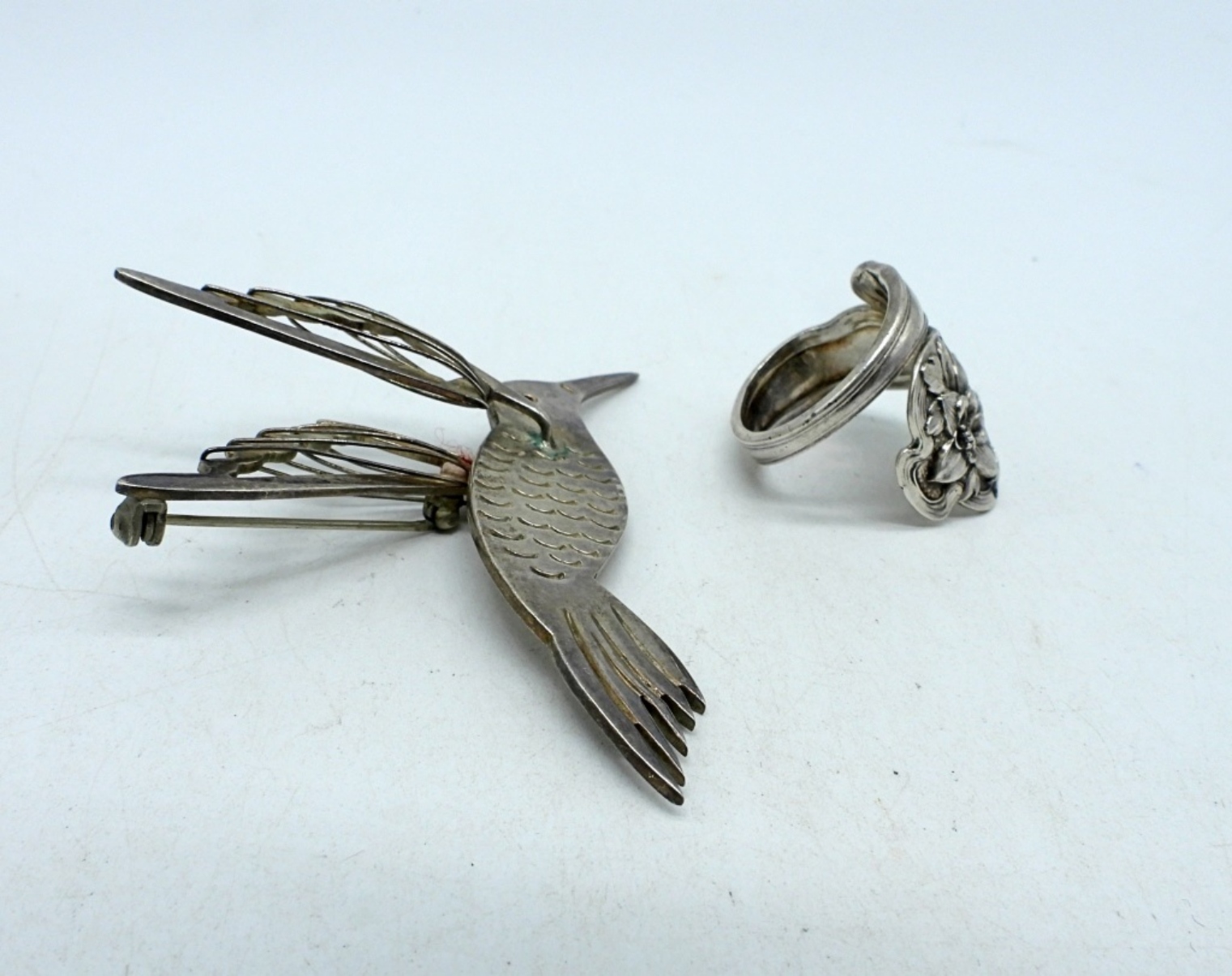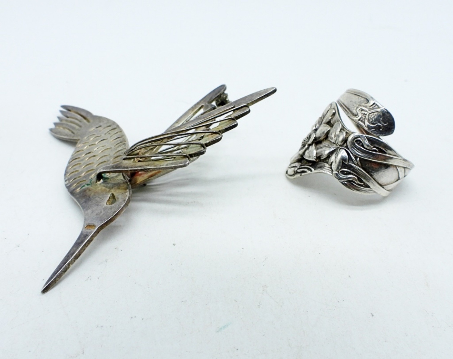 VINTAGE STERLING, TAXCO HUMMINGBIRD PIN. “TO-80 MEXICO 925″. 3″ x 2”. STERLING RING, SIZE 9. (14.8 DWT)