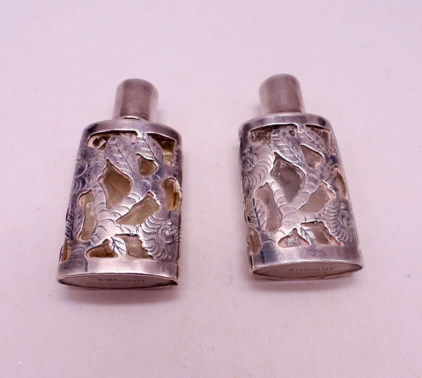 TWO STERLING ENCASED GLASS BOTTLES. MARKED STERLING 925. 2.5″ TALL, 1 1/4″ WIDE. (26 DWT)