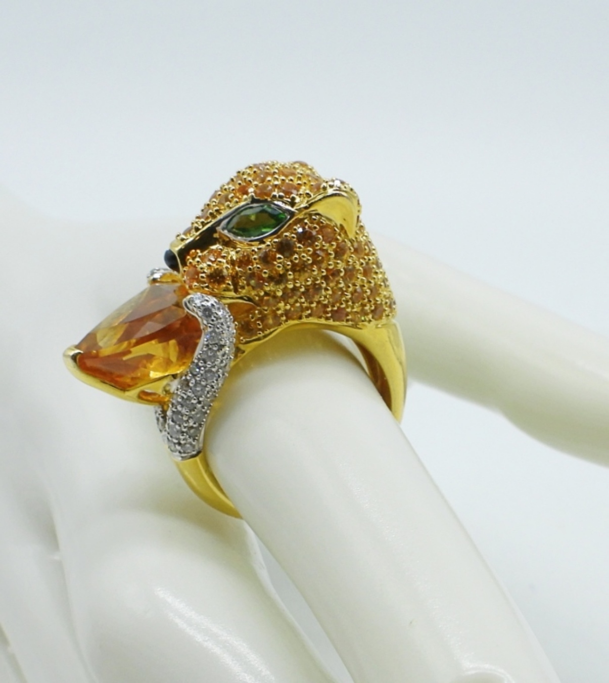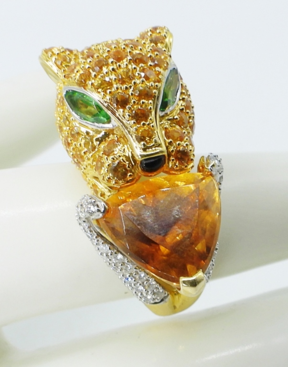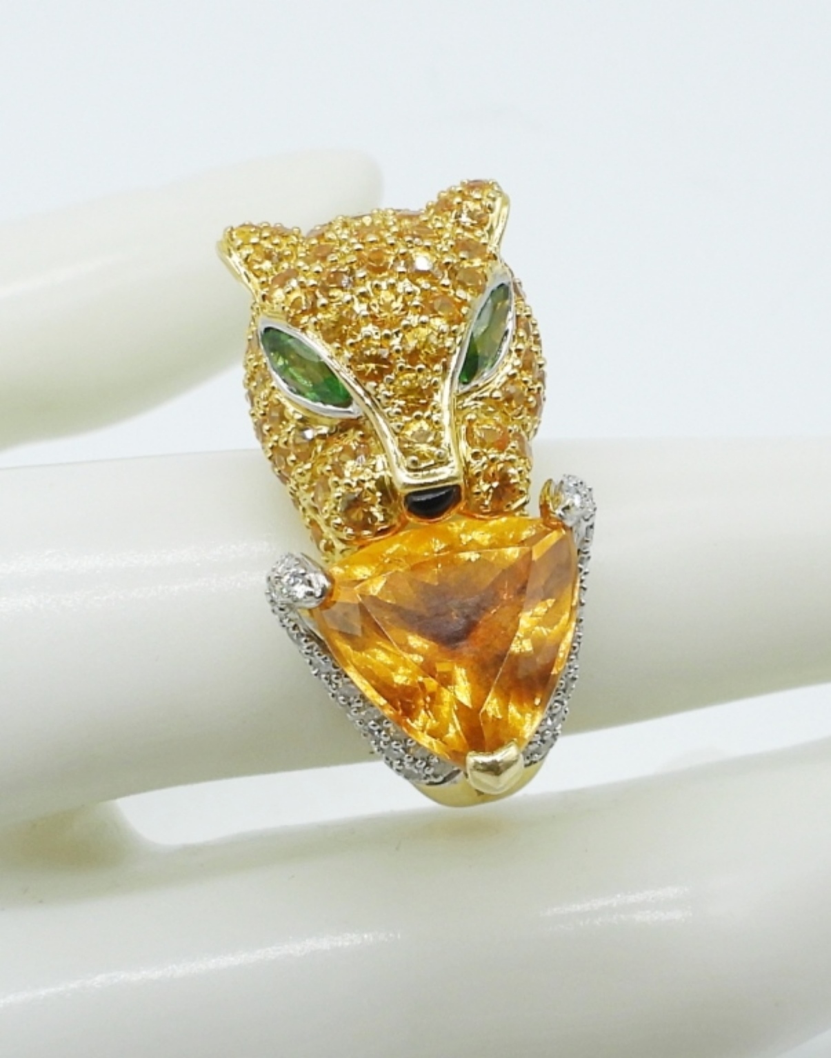 14K YELLOW GOLD BIG CAT RING. LARGE CITRINE GEMSTONE (5.42 CT) EMERALD EYES, .37 TW DIAMONDS / 3.19 TW YELLOW SAPPHIRES. 12 GRAMS 14K YELLOW GOLD. SIZE 7 (8DWT)