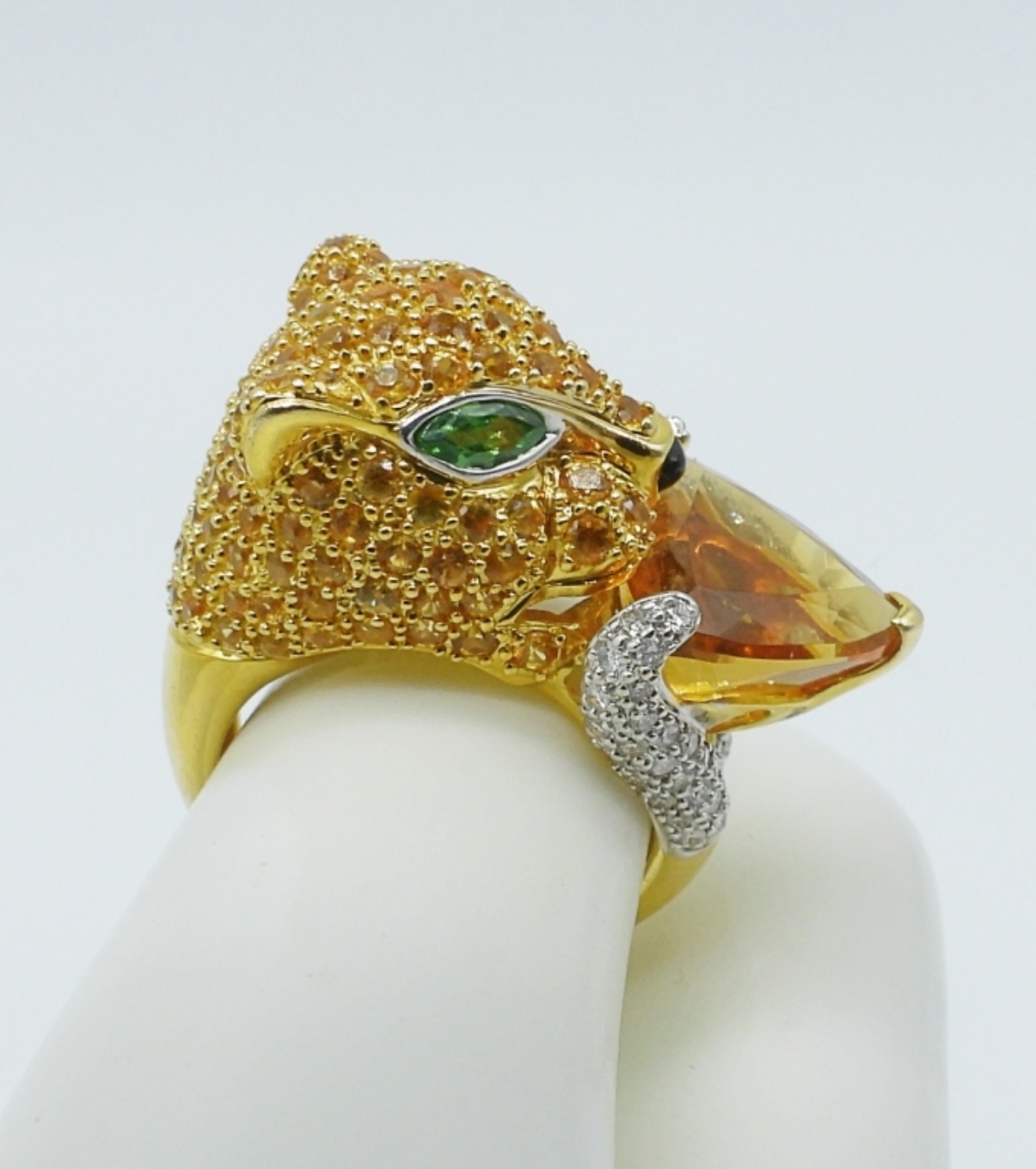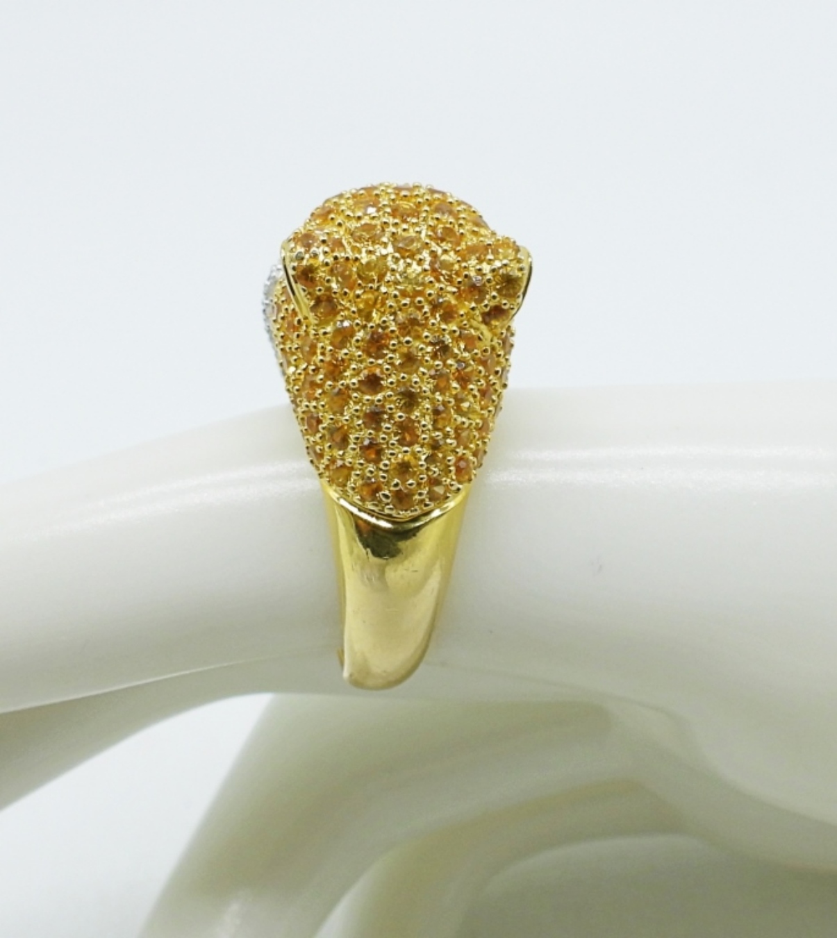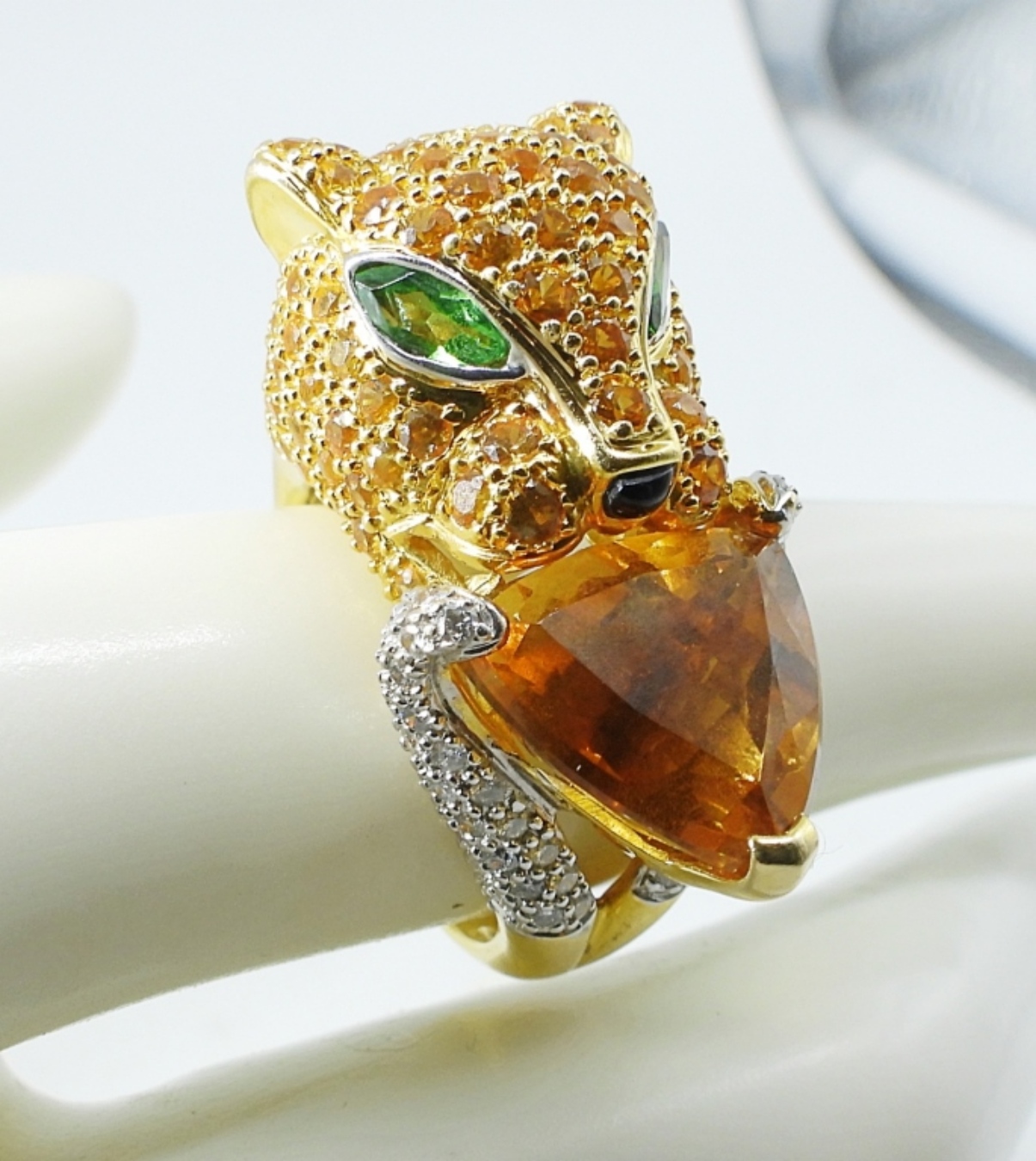 14K YELLOW GOLD BIG CAT RING. LARGE CITRINE GEMSTONE (5.42 CT) EMERALD EYES, .37 TW DIAMONDS / 3.19 TW YELLOW SAPPHIRES. 12 GRAMS 14K YELLOW GOLD. SIZE 7 (8DWT)