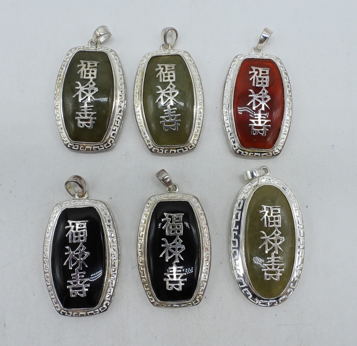 SIX STERLING GEMSTONE “GOOD FORTUNE” PENDANTS WITH WRITING. MARKED 925. 1.5″ LONG. (28 DWT)