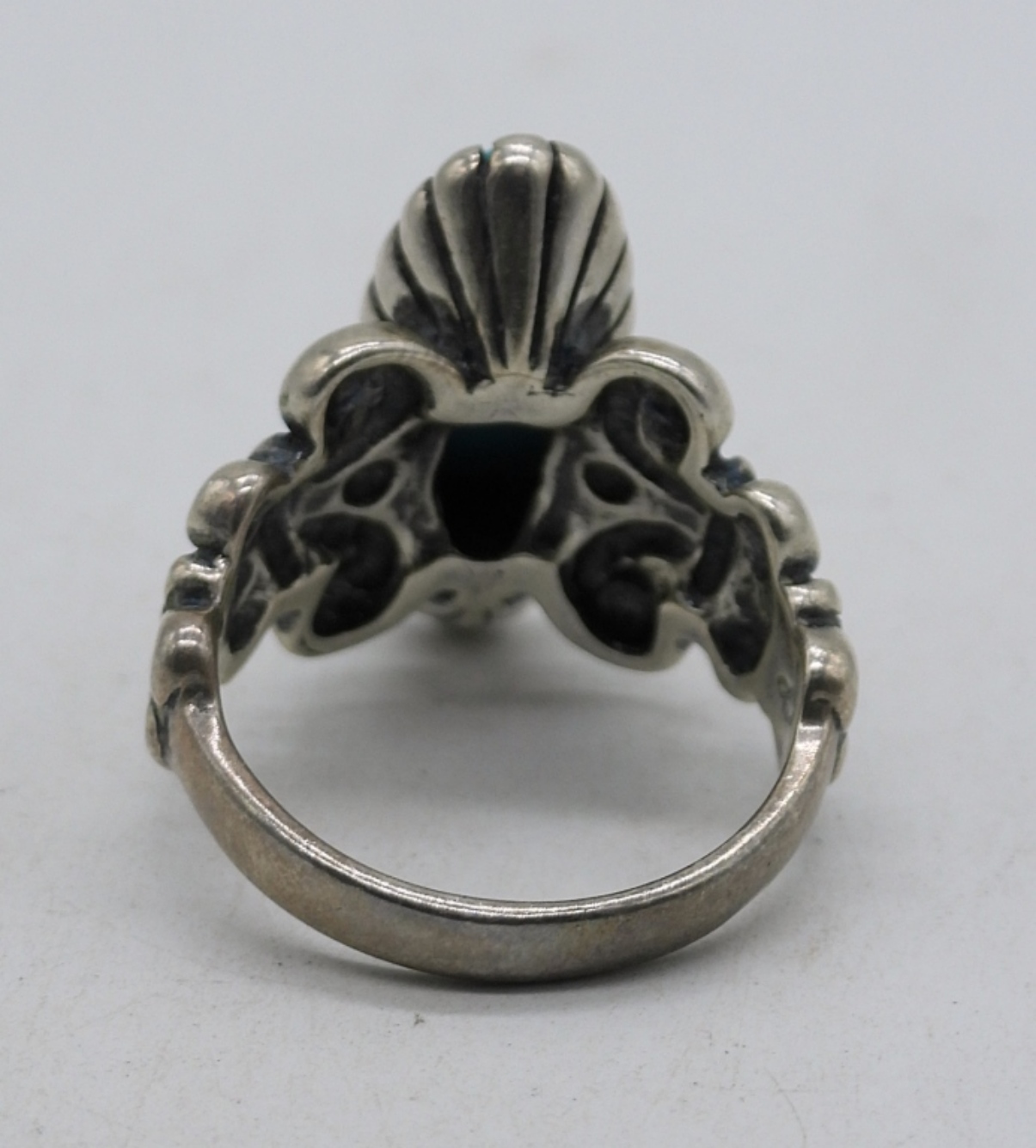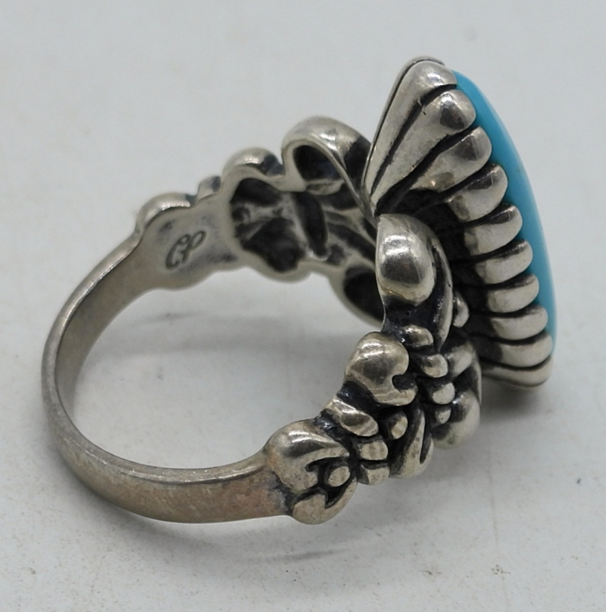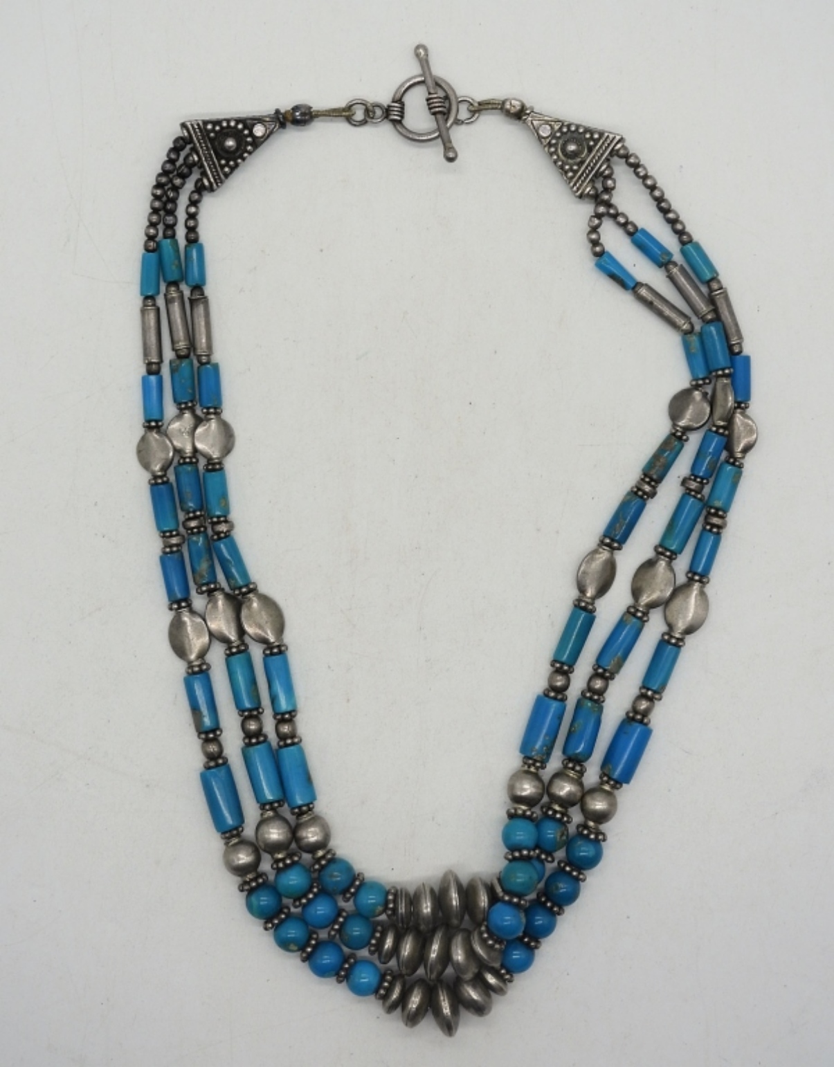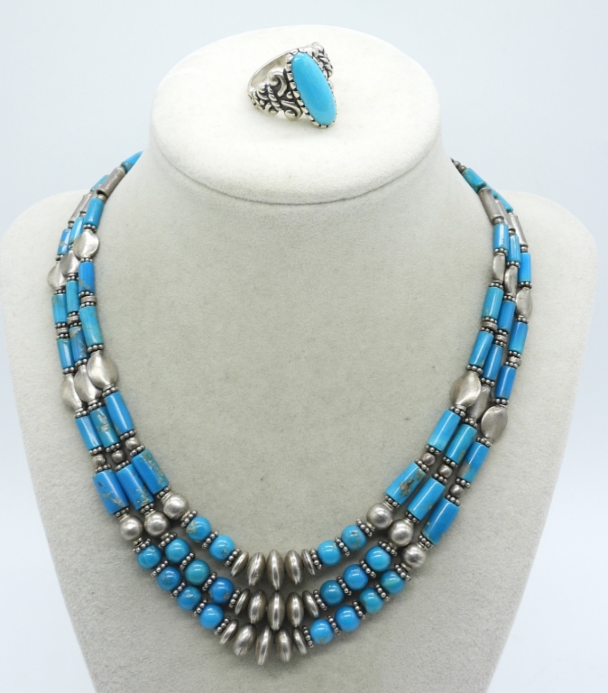 CAROLYN POLLACK STERLING TURQUOISE RING, SIZE 9. STERLING & TURQUOISE BEADED 3 STRAND NECKLACE, 15″. (36 DWT)