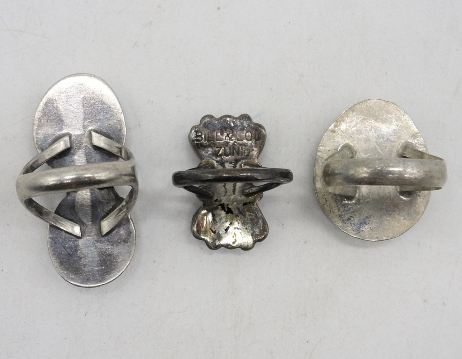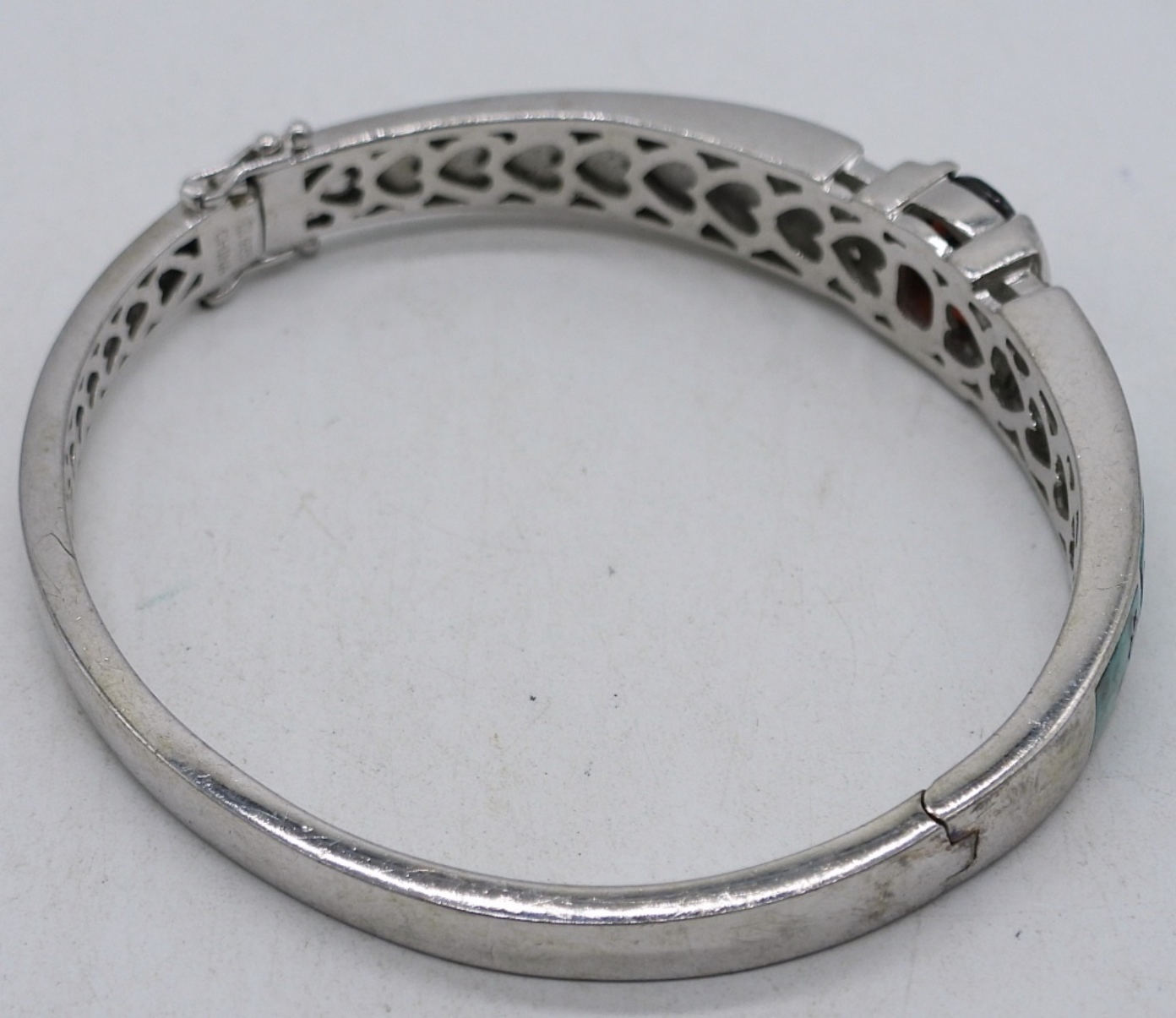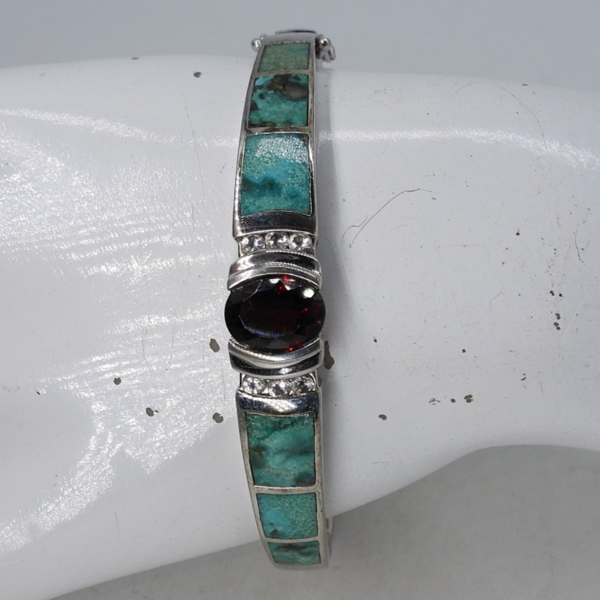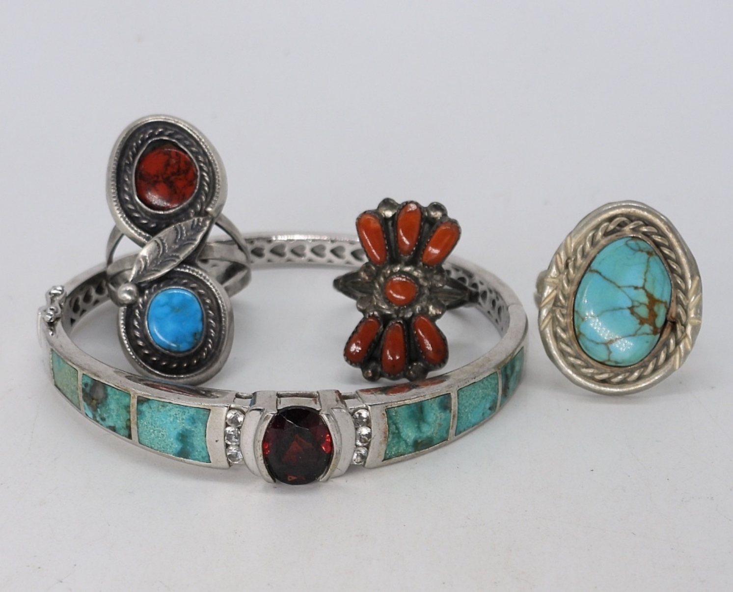 925 BRACELET WITH INLAID TURQUOISE AND GARNET, HINGED BANGLE. THREE STERLING RINGS WITH TURQUOISE GEMSTONES. SIZES 7, 7.5, 9. (31.2 DWT)