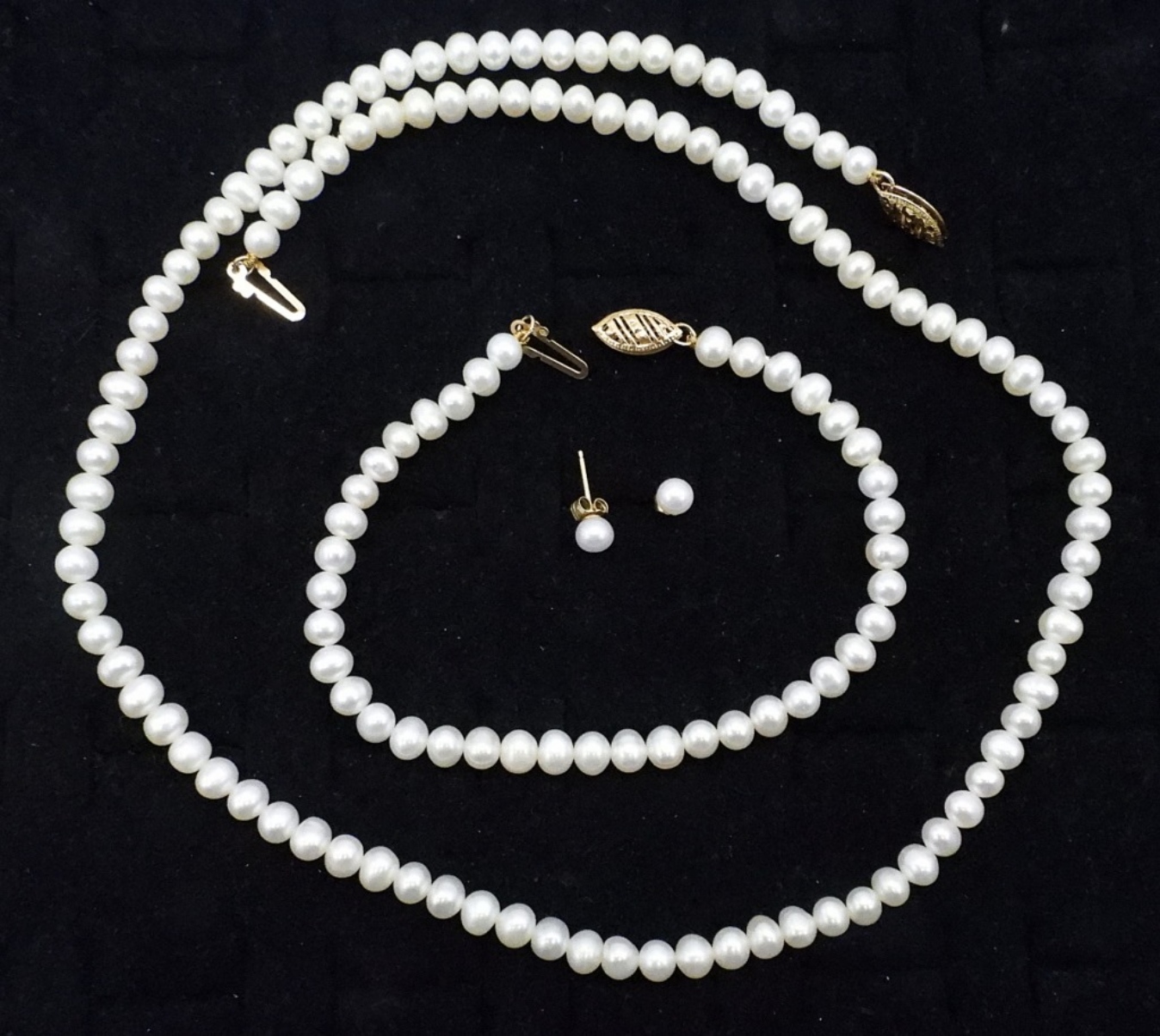 14K YELLOW GOLD, NATURAL PEARL SET. NECKLACE IS 18″. BRACELET IS 7″. PIERCED 14K PEARL EARRINGS. (1 DWT / 14KG)