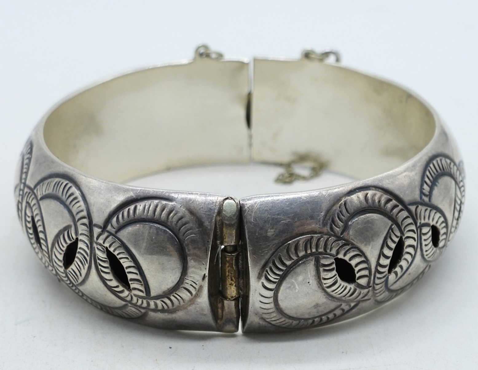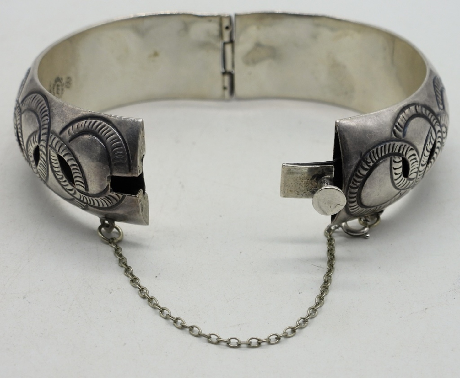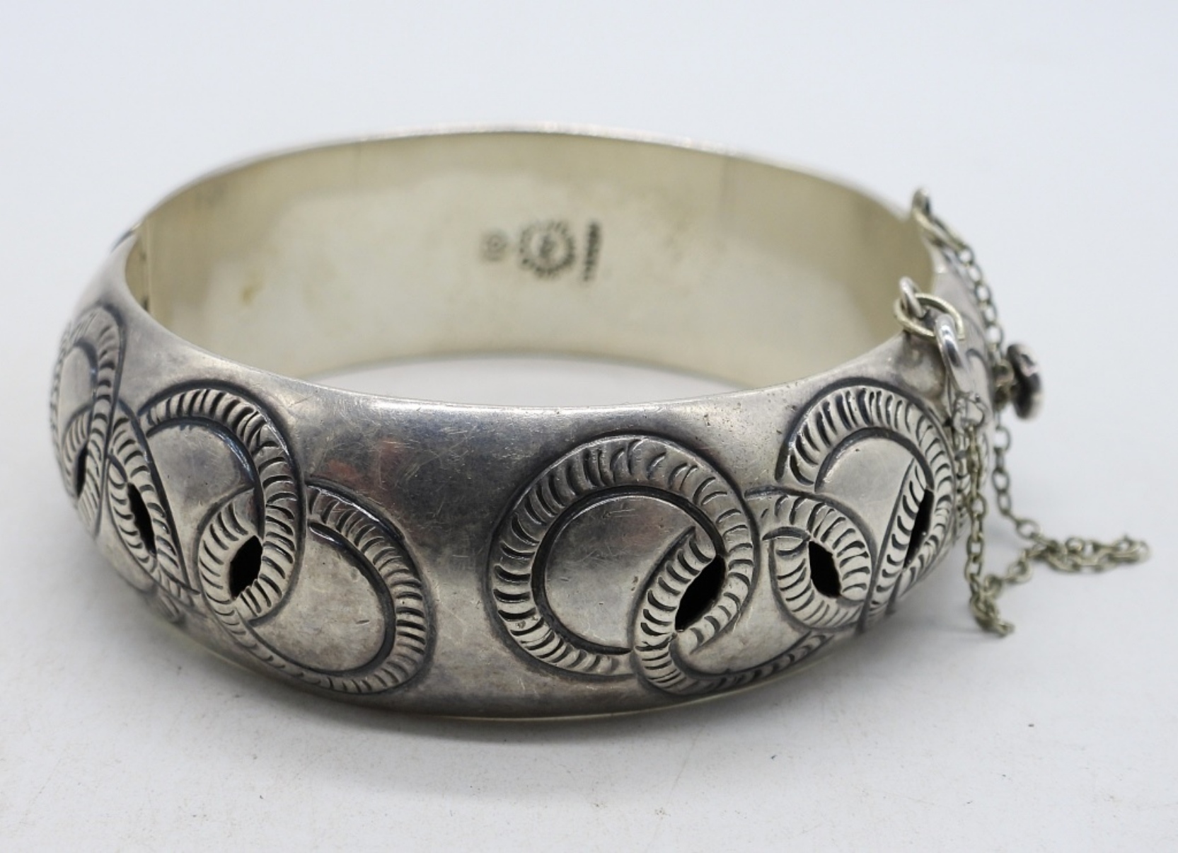 TAXCO STERLING HINGED CUFF BRACELET. MARKED “MEXICO STERLING TAXCO JSF”. (26 DWT)
