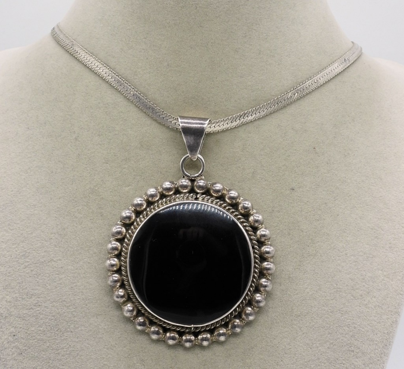 LARGE STERLING TAXCO BLACK ONYX PENDANT, 3″. ON A STERLING CHAIN, 22″. (37 DWT)