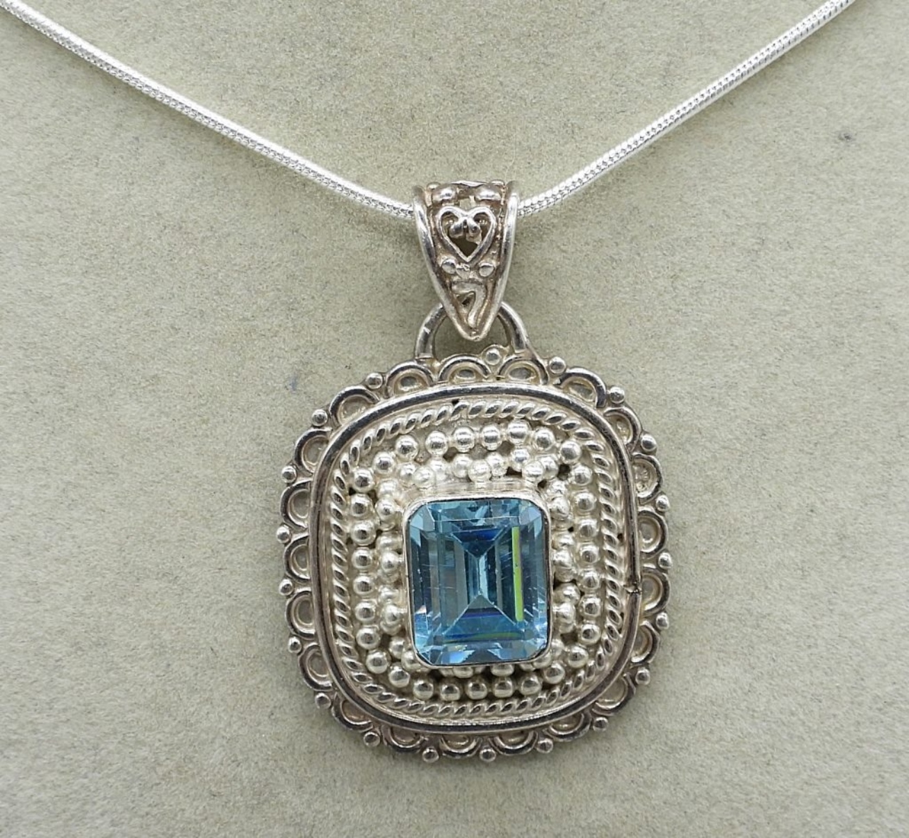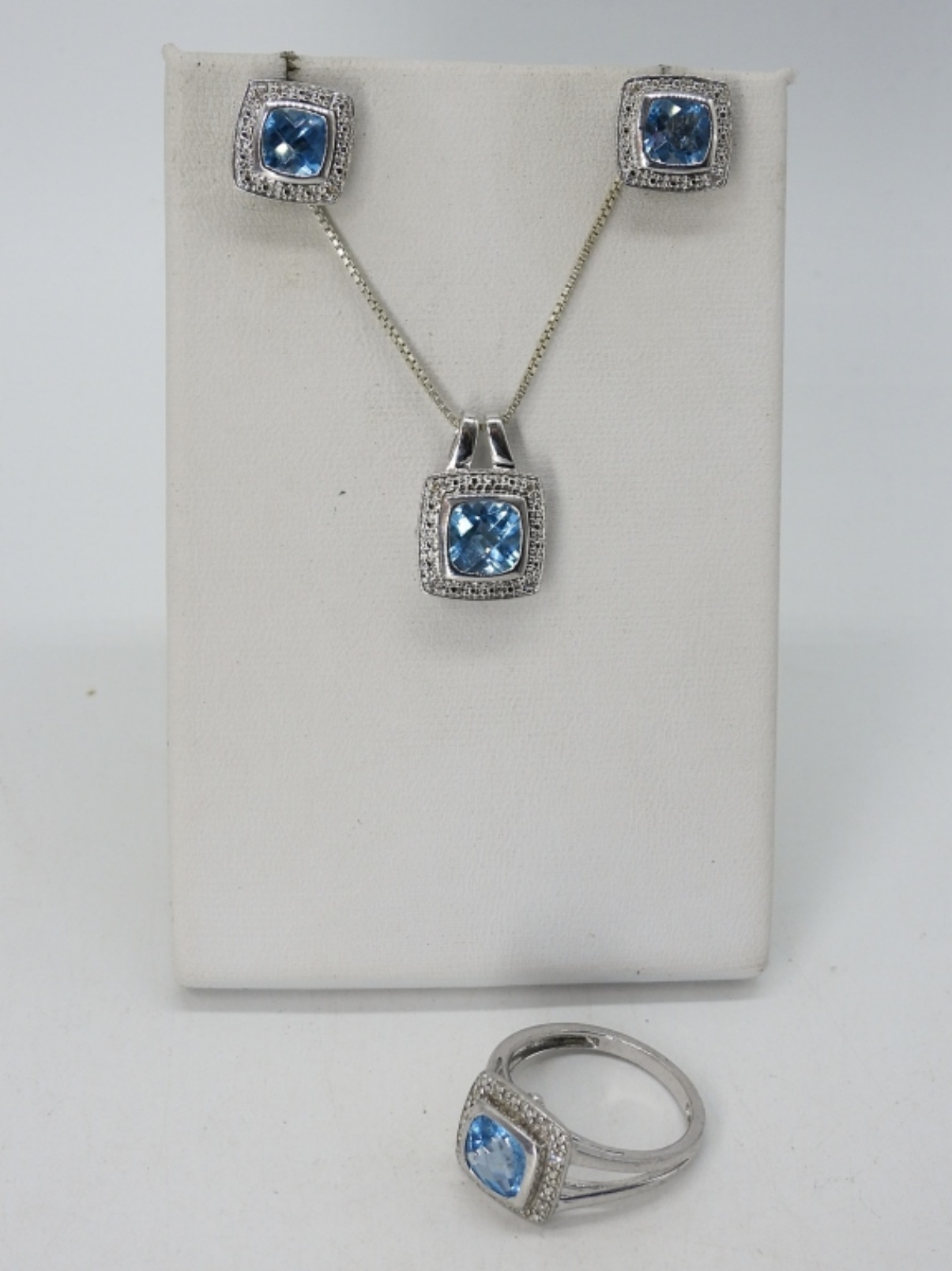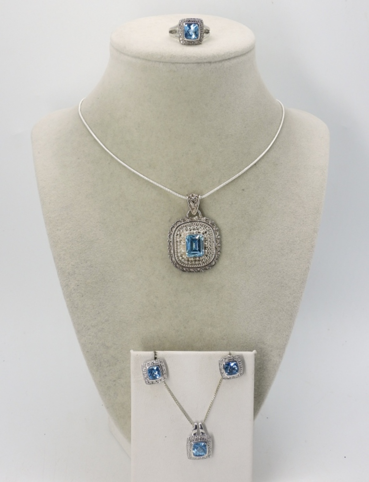 BLUE TOPAZ GEMSTONES IN STERLING SILVER. TWO NECKLACES, 18″ & 22″. BLUE TOPAZ RING, SIZE 7. MATCHING PIERCED EARRINGS. (17.6 DWT)