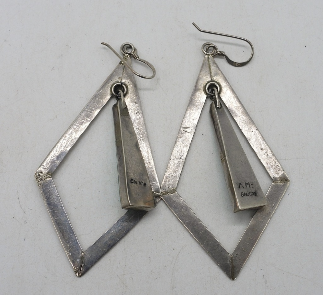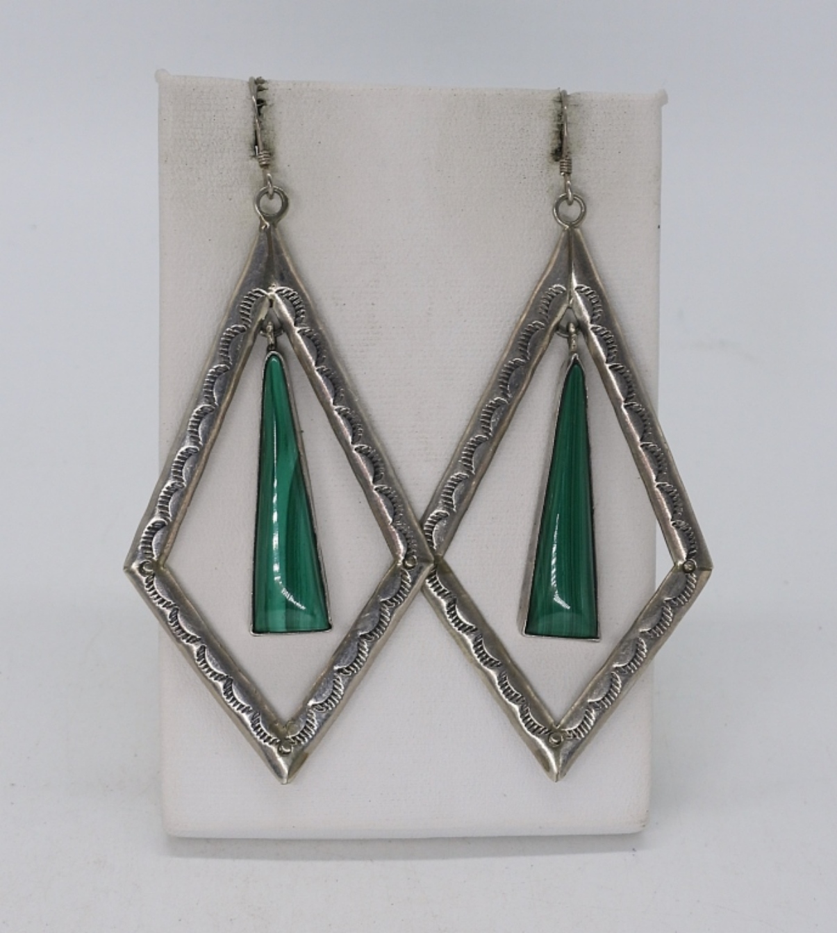 ONE PAIR OF VINTAGE STERLING PIERCED EARRINGS WITH MALACHITE GEMSTONES. 3″ LONG. (10.2 DWT)