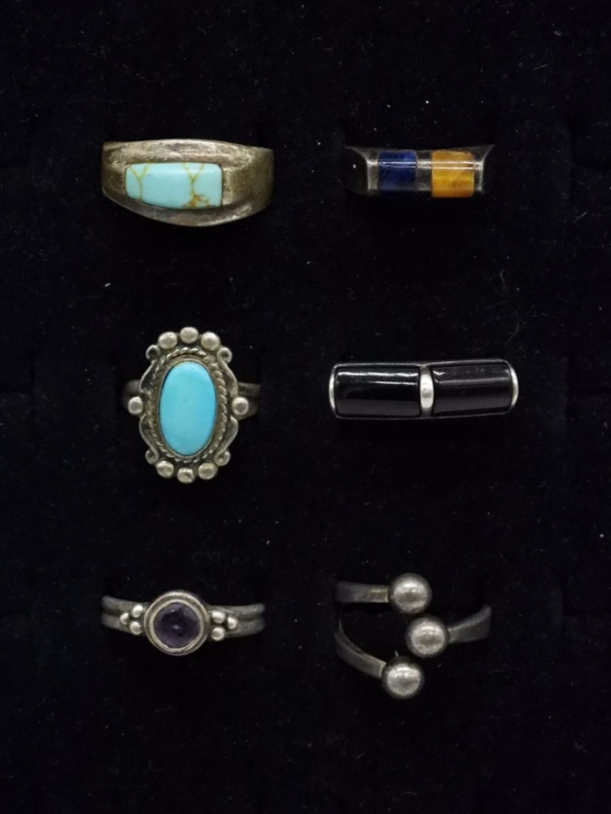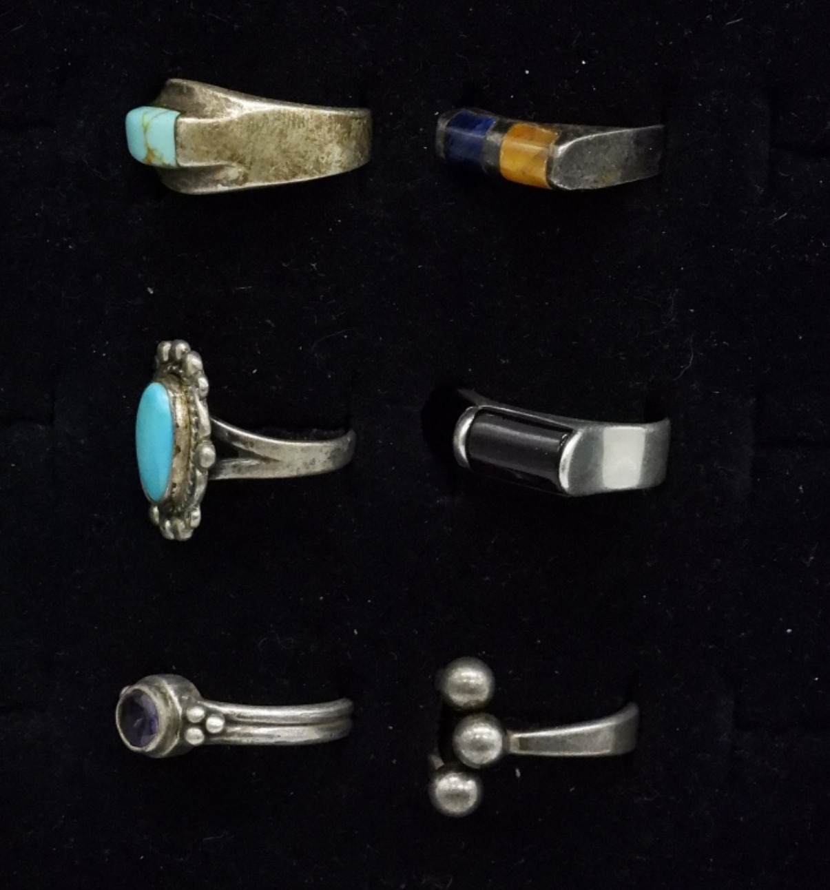 SIX VINTAGE STERLING RINGS. TURQUOISE, TIGERS EYE, BLACK ONYX, AMETHYST GEMSTONES. SIZES 6-9 (20.7 DWT)