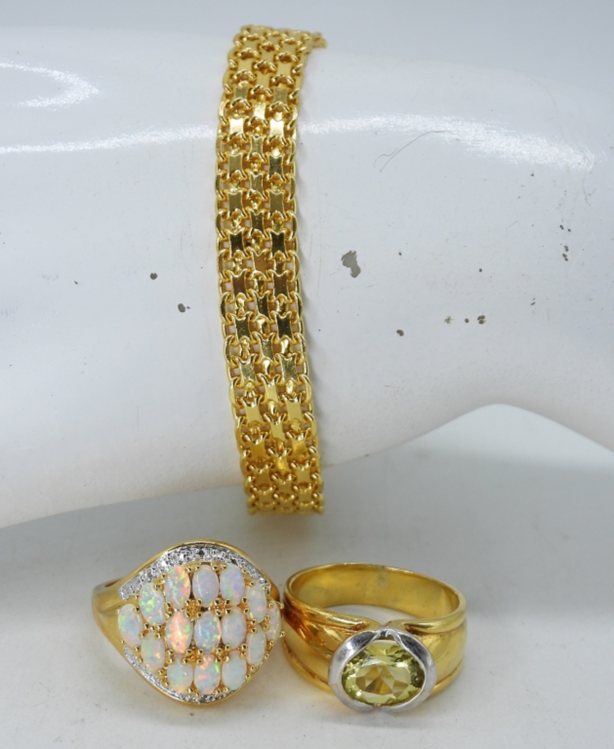 TWO GOLD TONE STERLING RINGS WITH OPALS AND CITRINE. SIZE 9-9.5. GOLD TONE STERLING BRACELET, 7.5″. (19.9 DWT)