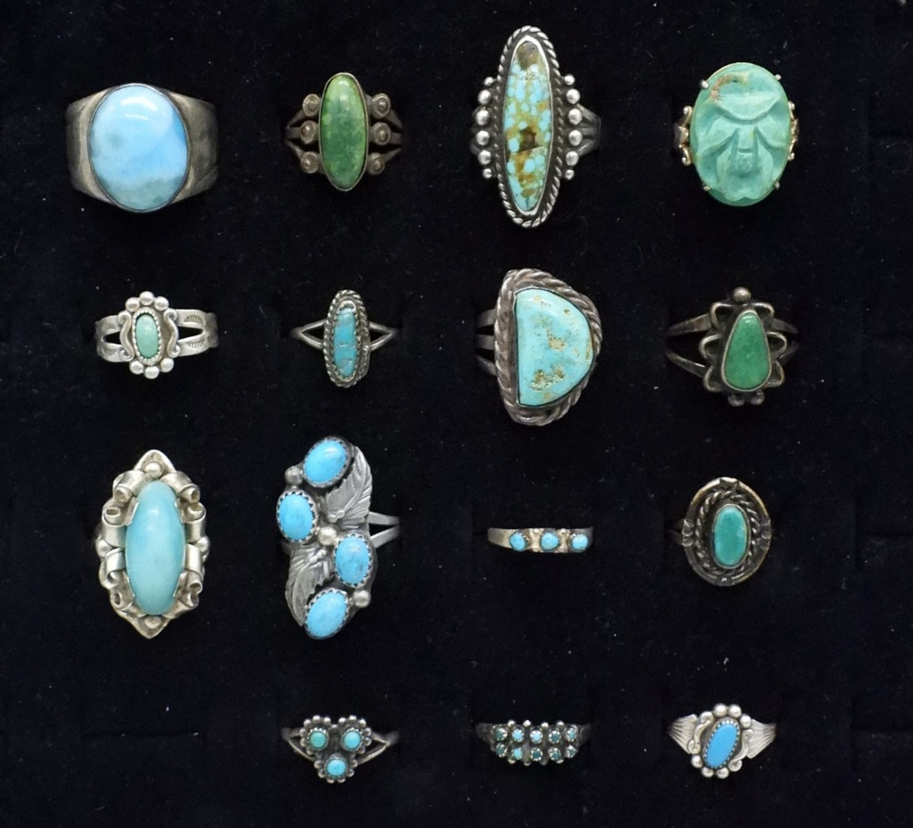 15 STERLING TURQUOISE & LARIMAR RINGS. SIZES 3-10 (38 DWT)