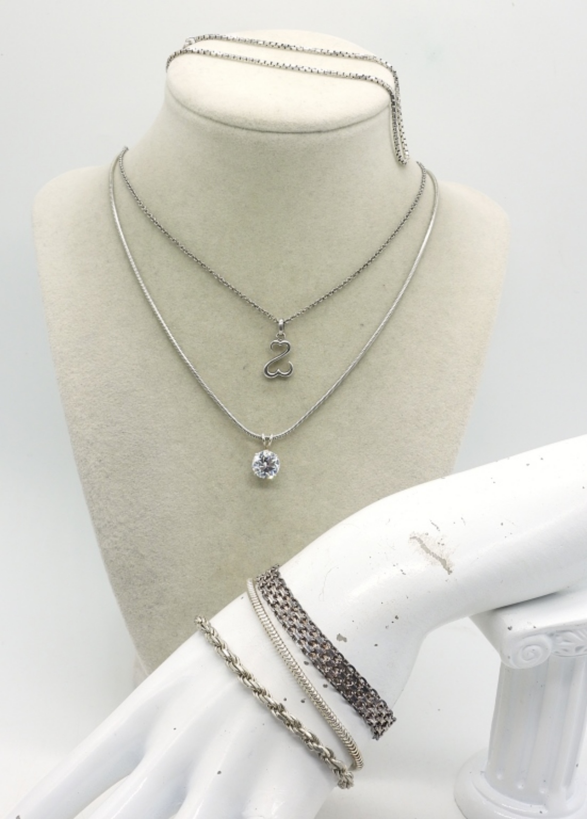 TWO STERLING NECKLACES, OPEN HEART & FAUX DIAMOND, 18″. THREE STERLING BRACELETS 7-8″. ONE STERLING ANKLET 9.5″. (28.6 DWT)
