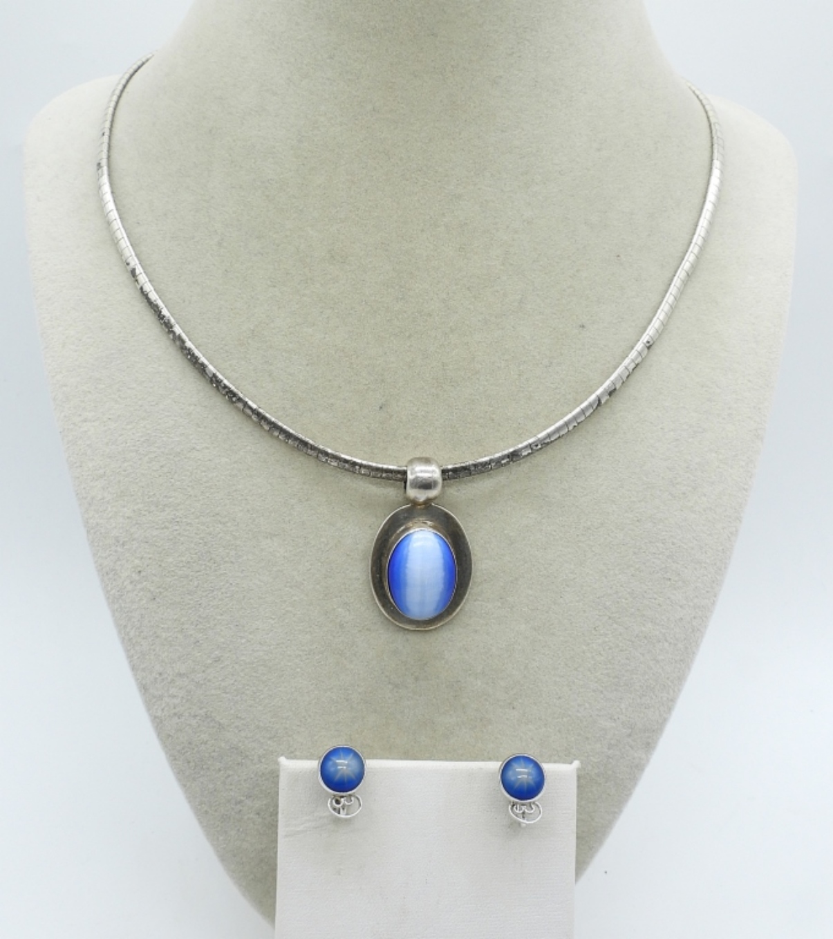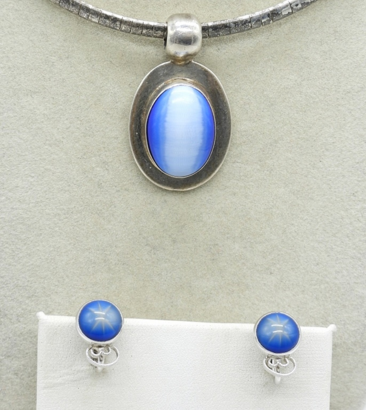 VAN DELL STERLING STAR SAPPHIRE SCREW BACK EARRINGS. ATI 925 CATS EYE NECKLACE, 16″. (17.8 DWT)