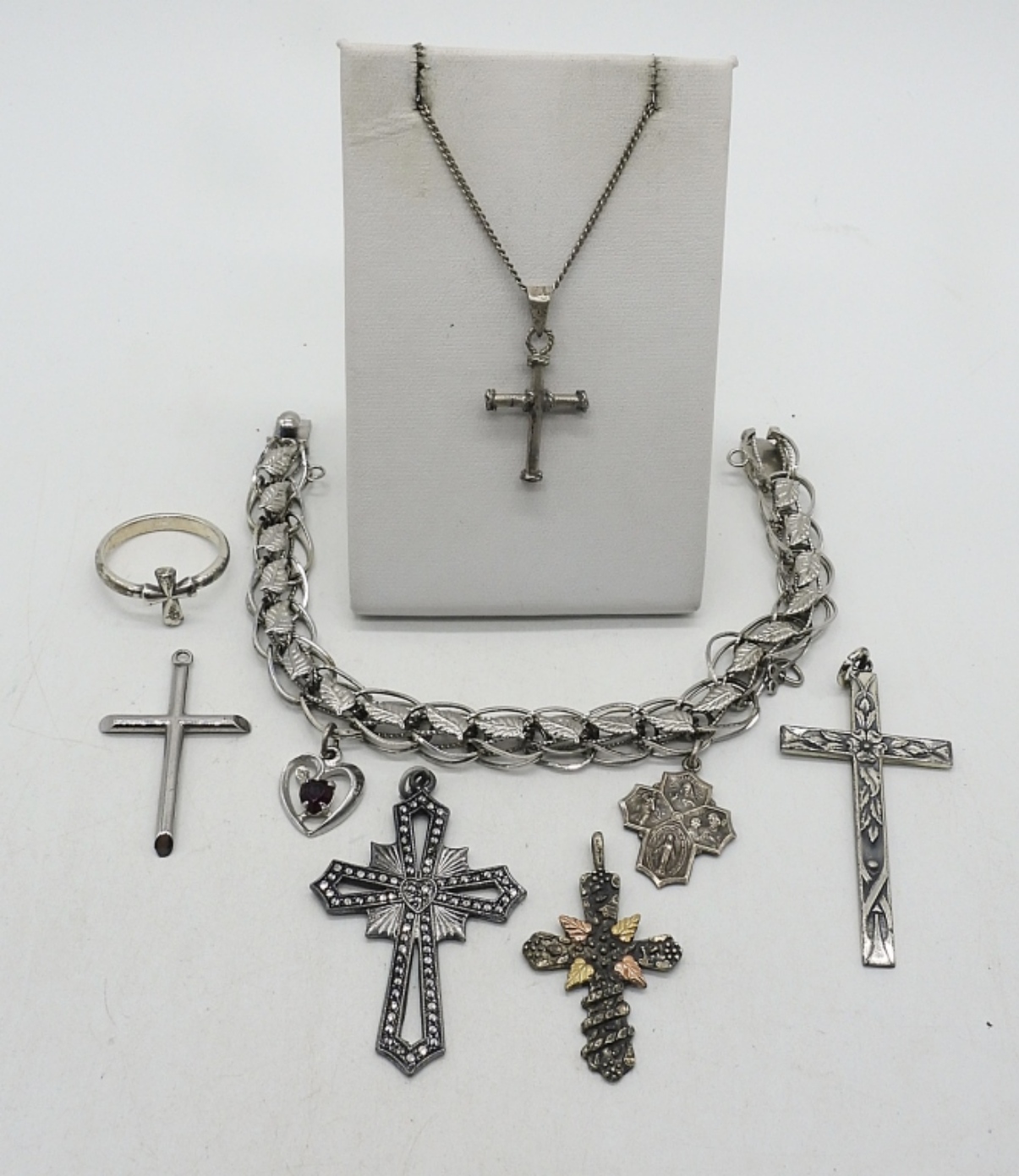 ALL STERLING. FIVE PENDANTS, ONE 15″ CHAIN. RING SIZE 8. CHARM BRACELET WITH TWO CHARMS, 7.5″. (27 DWT)