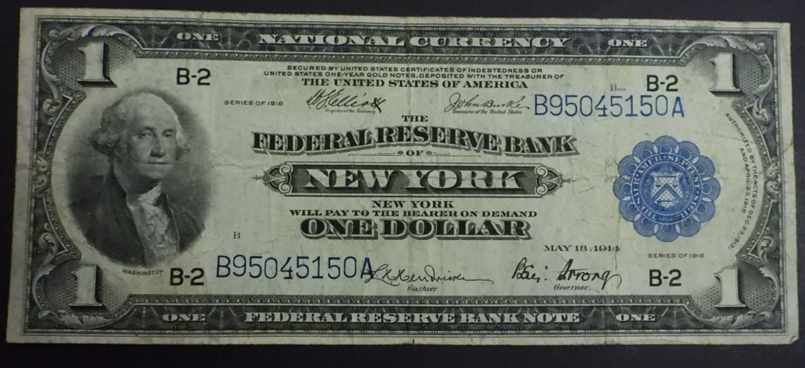 1918 New York $1 Bill, Large Size. Large Bill