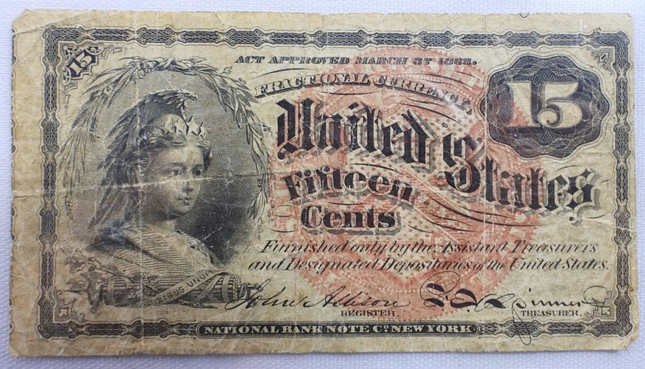 Act of 1863, 15 Cent Fractional Currency. Small Bill.