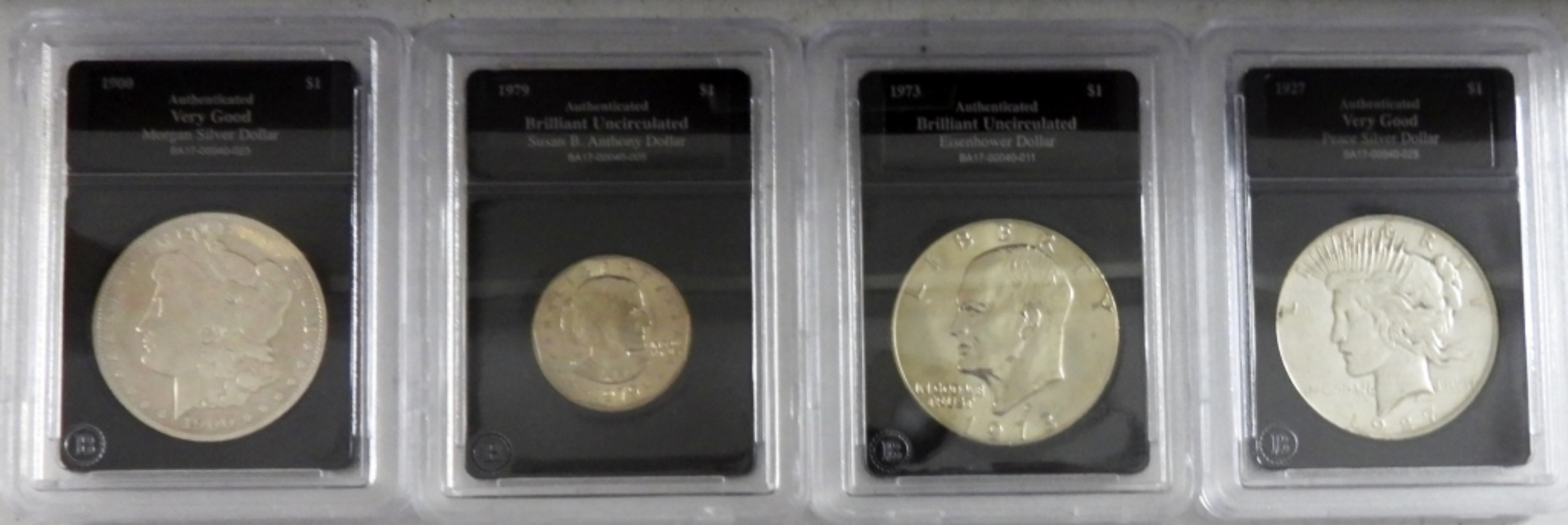 (6) VG Morgans, (9) VG Peace, (7) BU IKEs, & (4) BU SBAs In Display Box All In Bradford Slabs No Silver IKEs