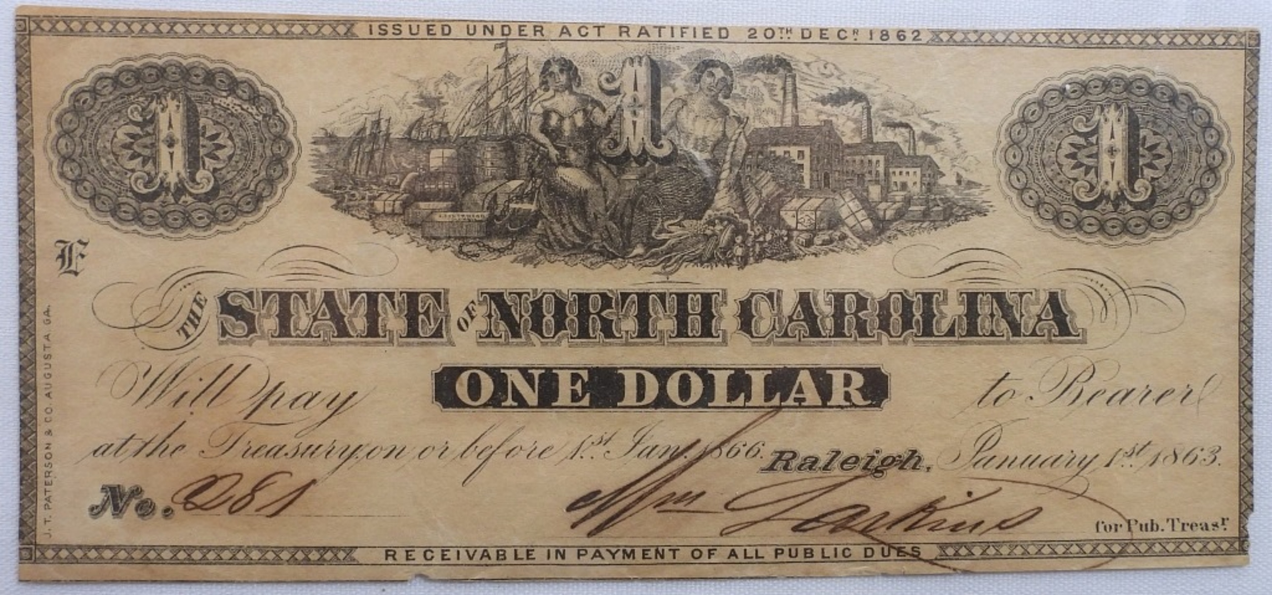 The State of North Carolina $1 Bill – Raleigh 1863. No 281