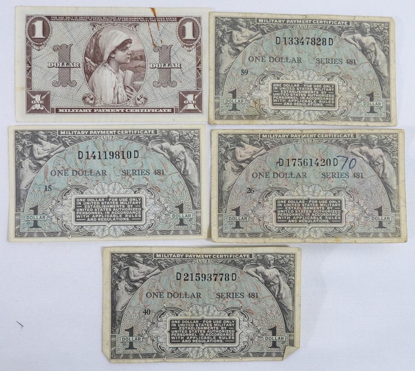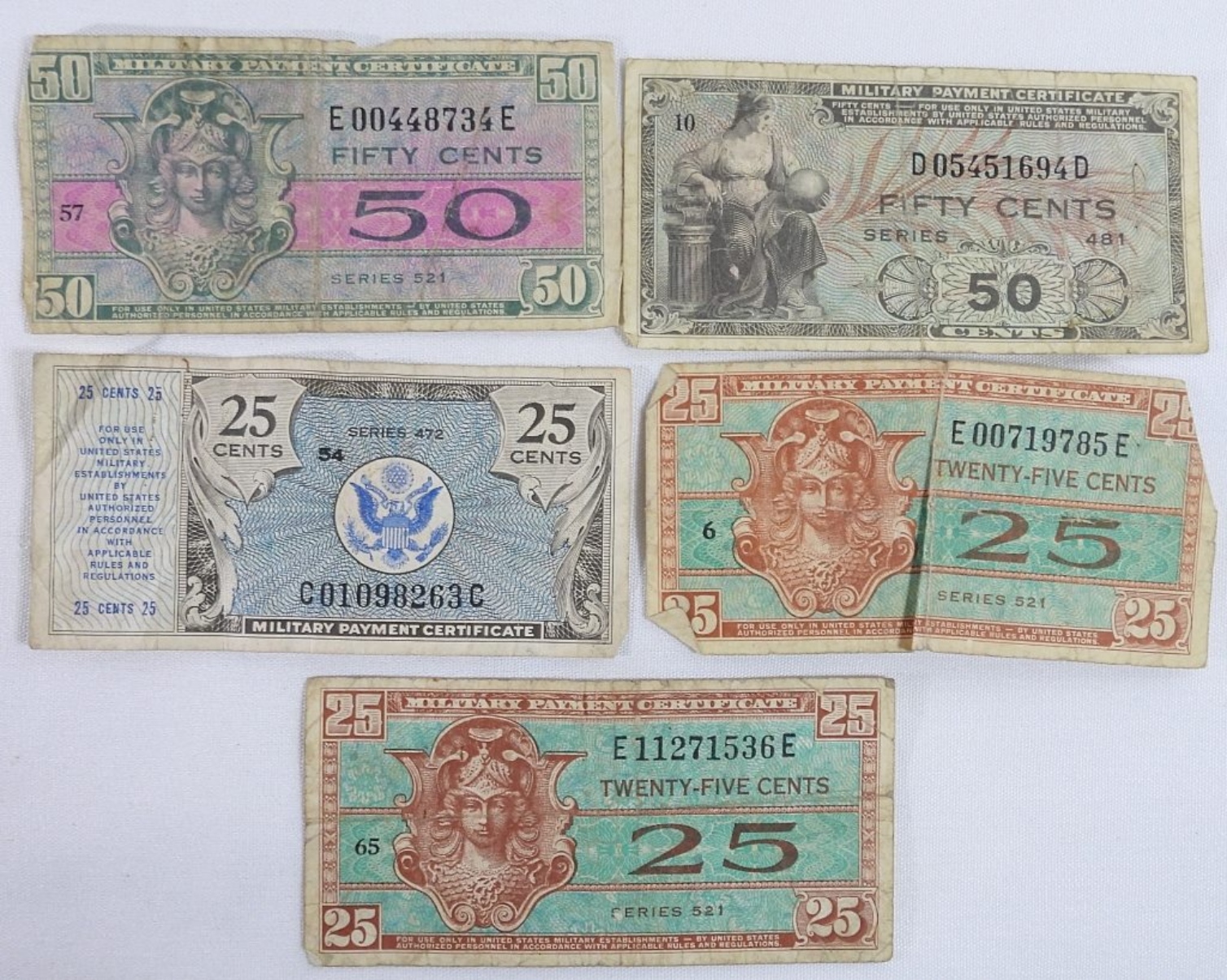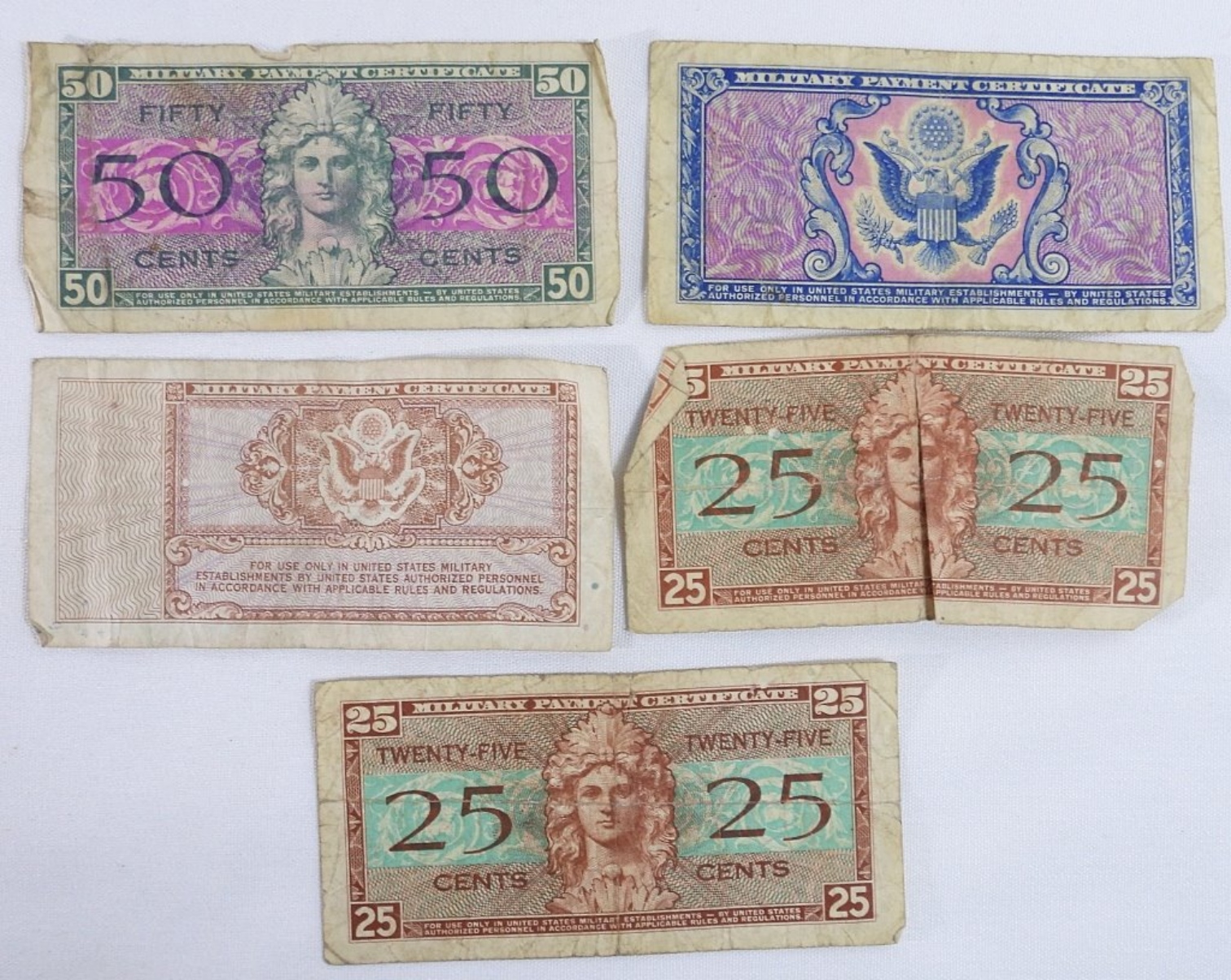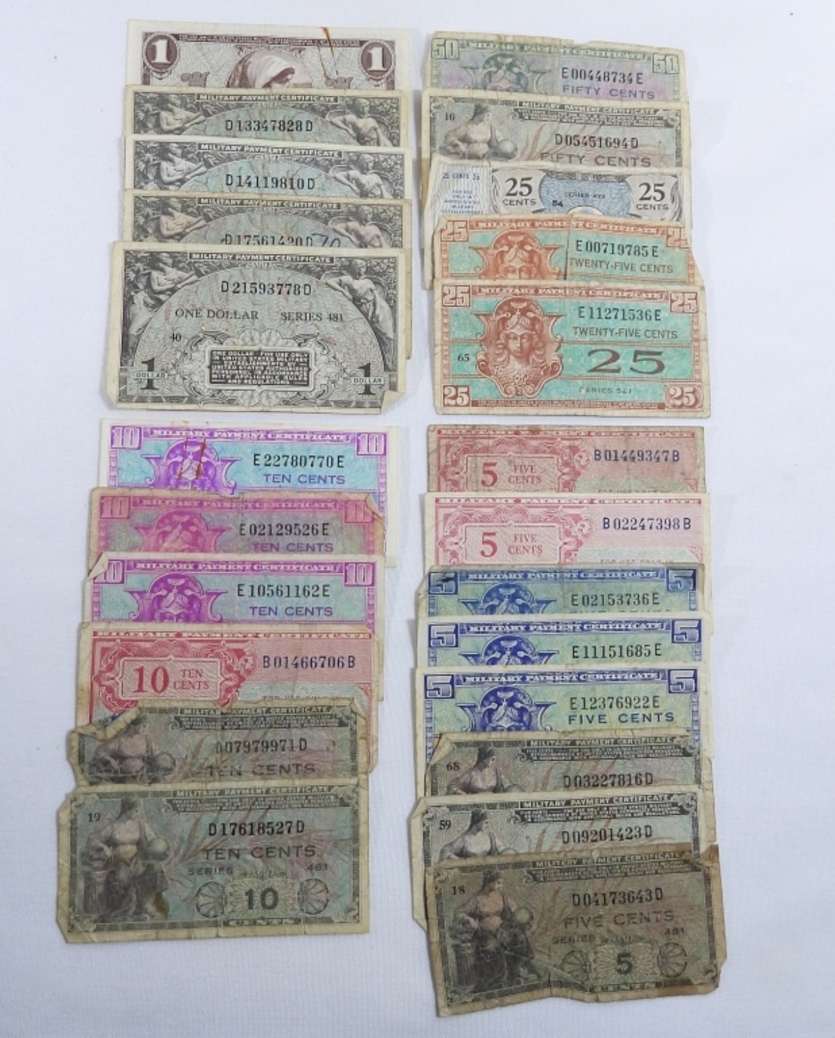 24 U.S. Military Payment Certificates. Ranging from 5 Cents to 1 Dollar.