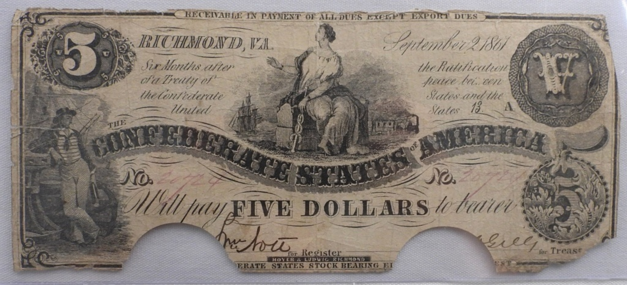 Cancelled Confederate States of America $5 Large Bill. Richmond Virginia. No 20424
