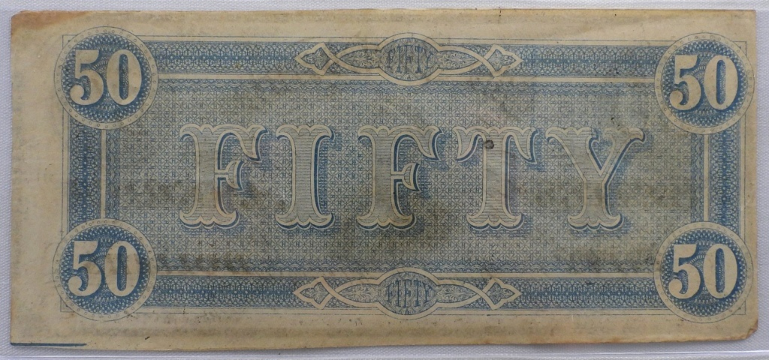 1864 Fifty Dollar Confederate States of America Bill. Bent Corners & Some Staining. In nice condition.