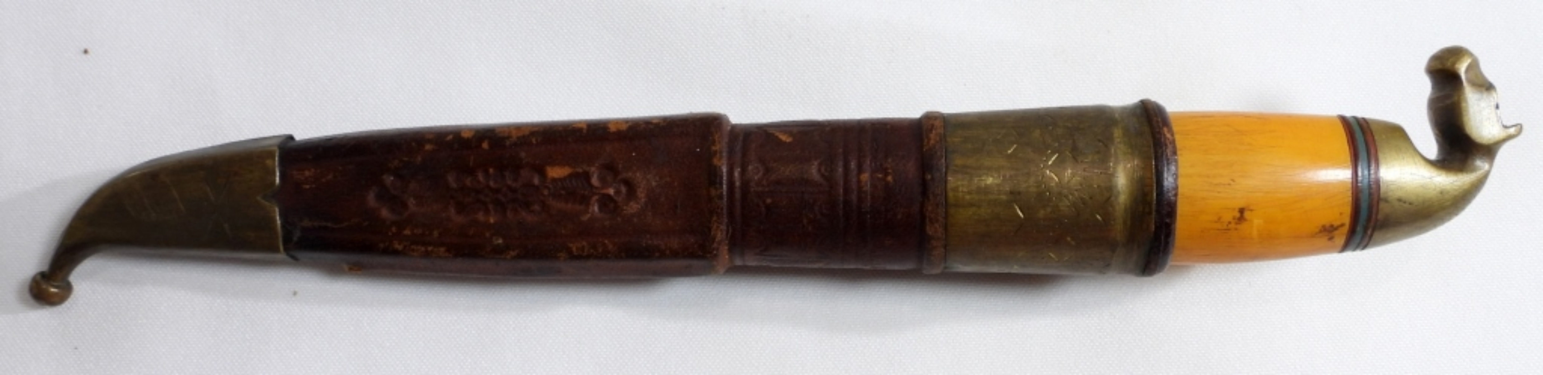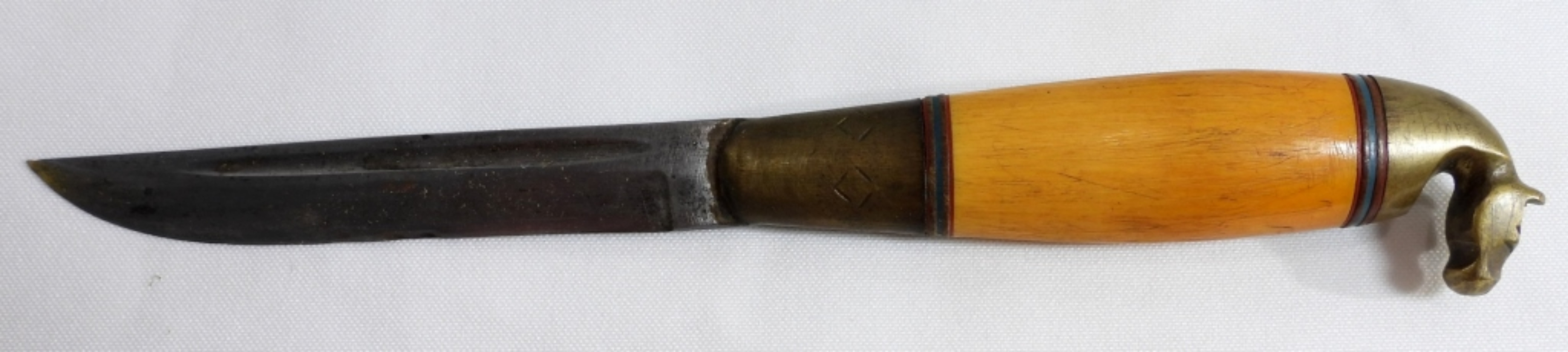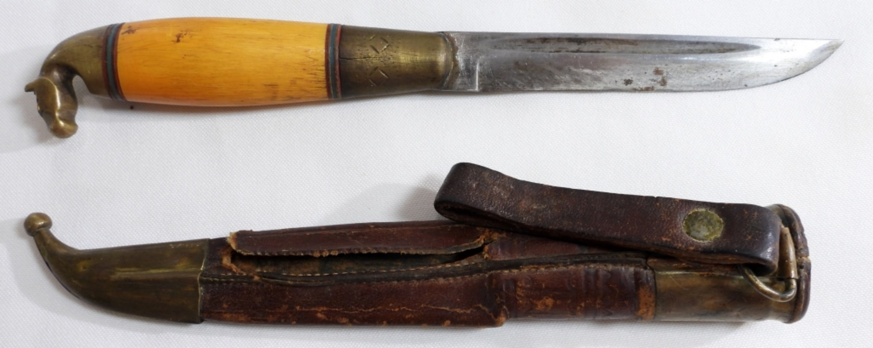 This beautiful knife has a brass horse head. Comes with a leather sheath.