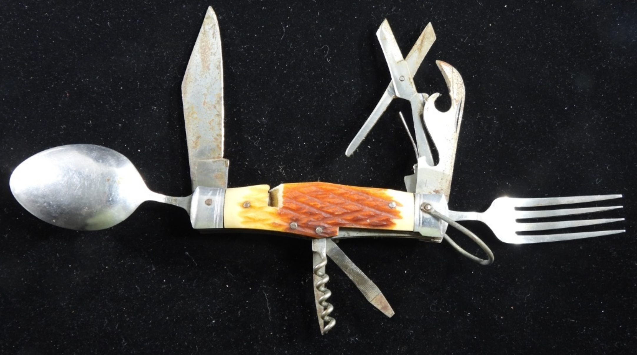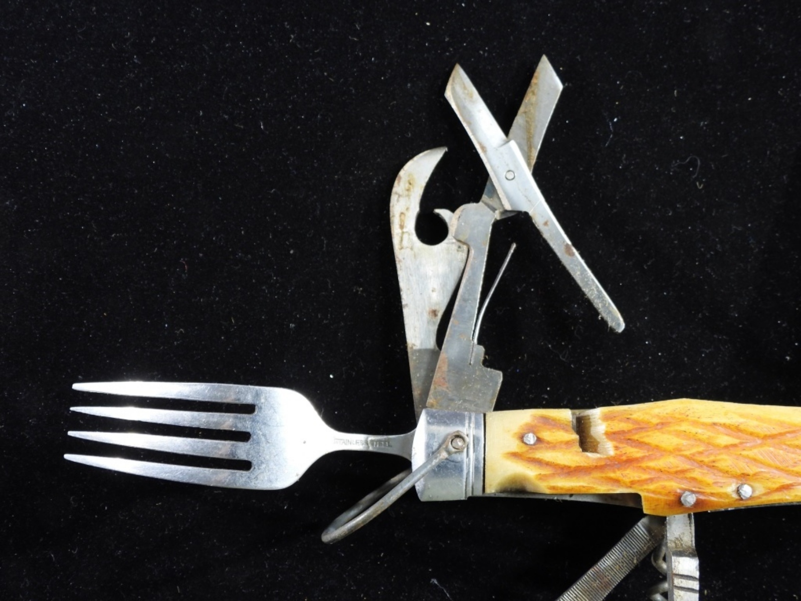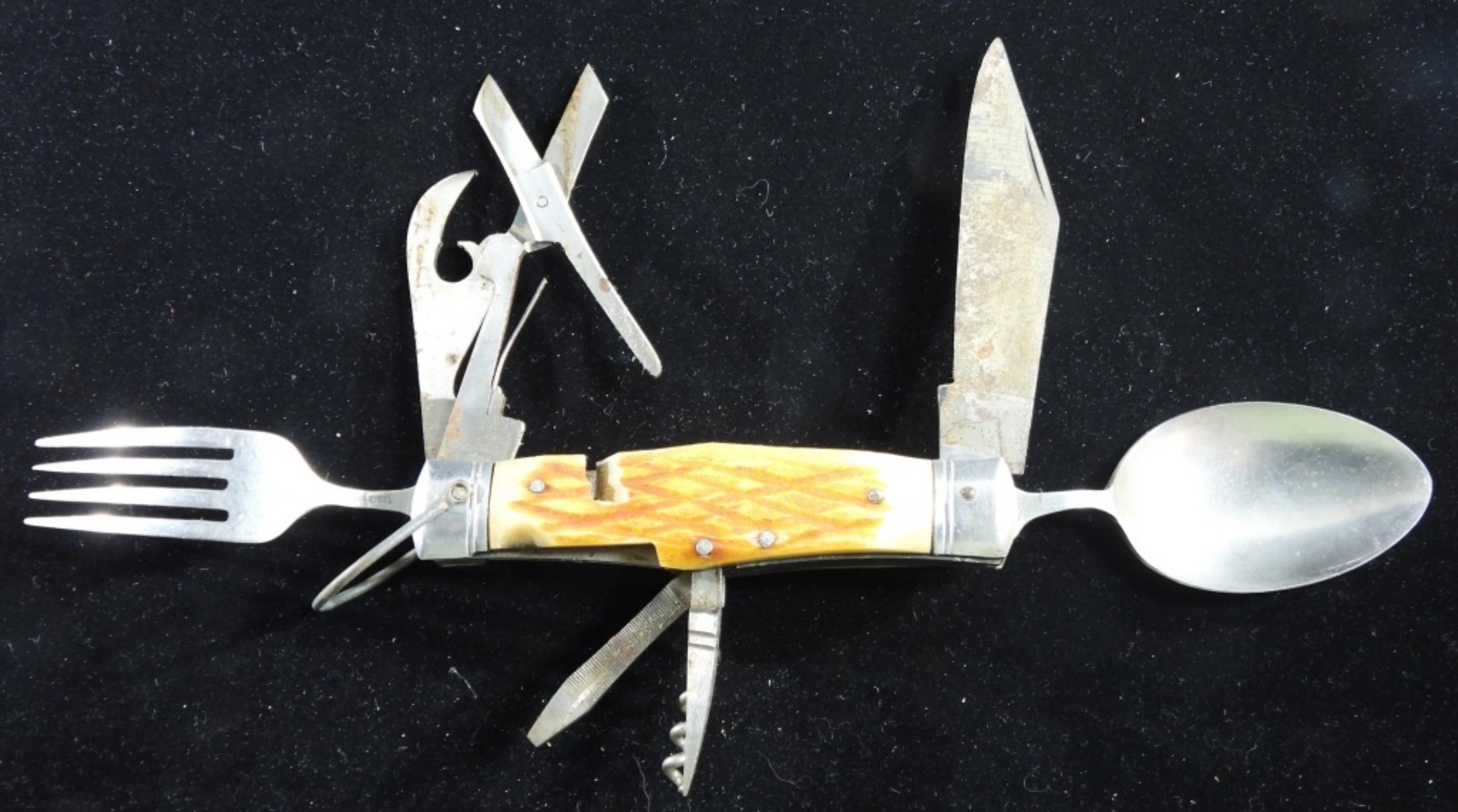 Multi Tool Stainless Fork & Spoon, Folding Knife, Opener, Scissors Vintage. It is a bit hard to open.