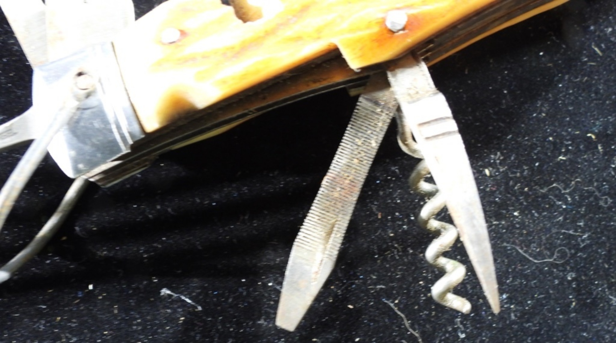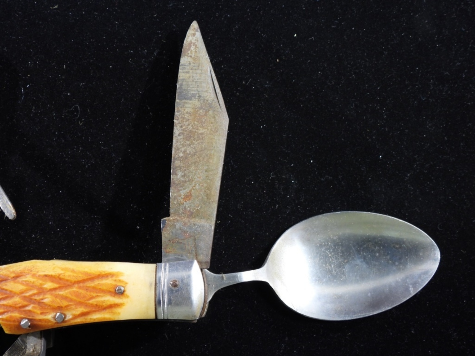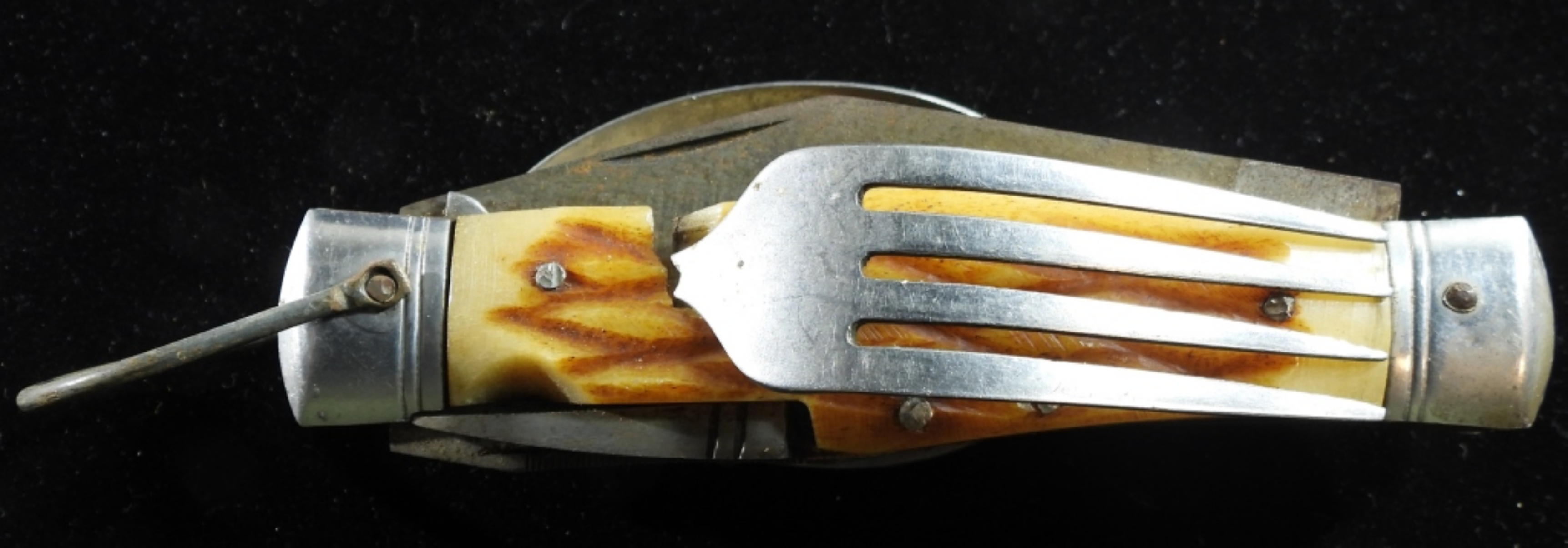 Multi Tool Stainless Fork & Spoon, Folding Knife, Opener, Scissors Vintage. It is a bit hard to open.