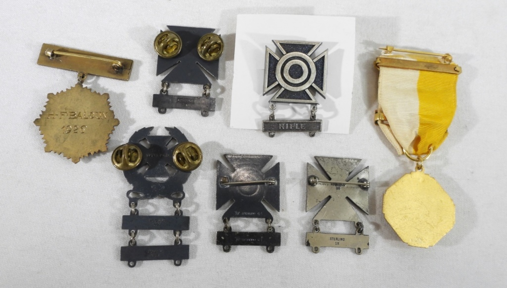 (5) military sharp shooter pins, (1) 1948 Duchess county pistol assn, center fire, slow fire, Sharpshooter class 1st, (1) NRA .22 Calibre Pistol outdoor timed fire