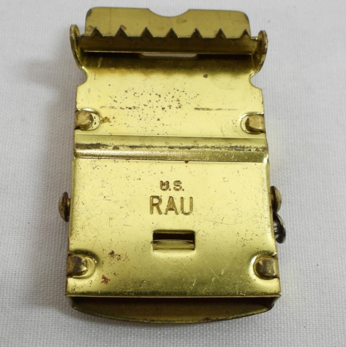 1- Saint Michael Protect us U.S. Army money clip, 1- Belt Buckle (marked U.S. RAU), 1- Brass whistle marked “Military Made in the USA”