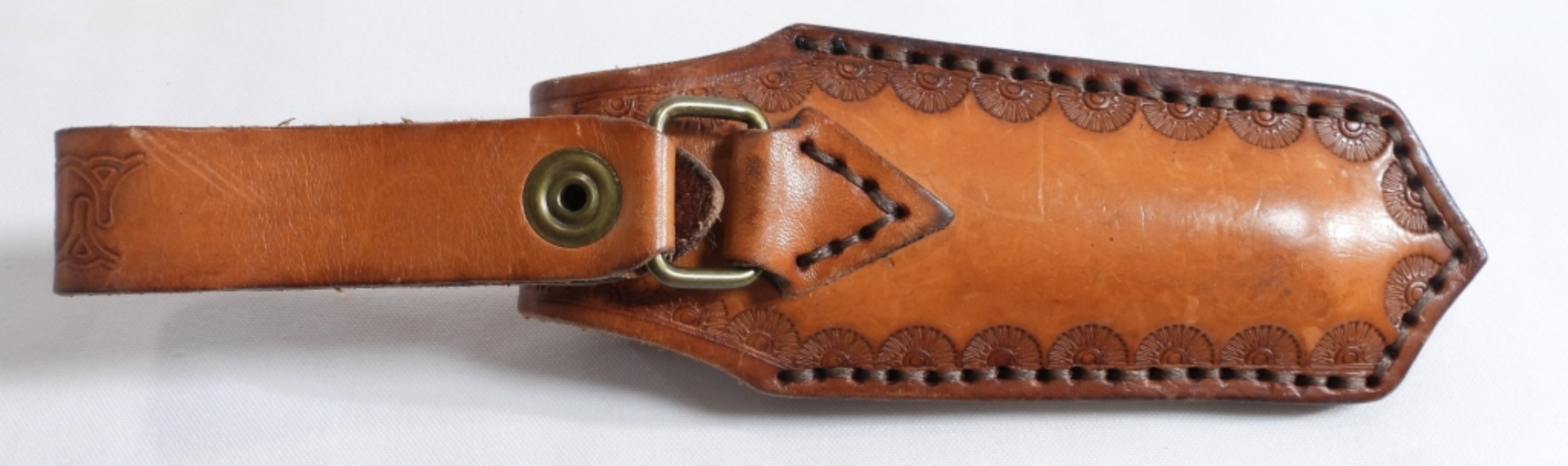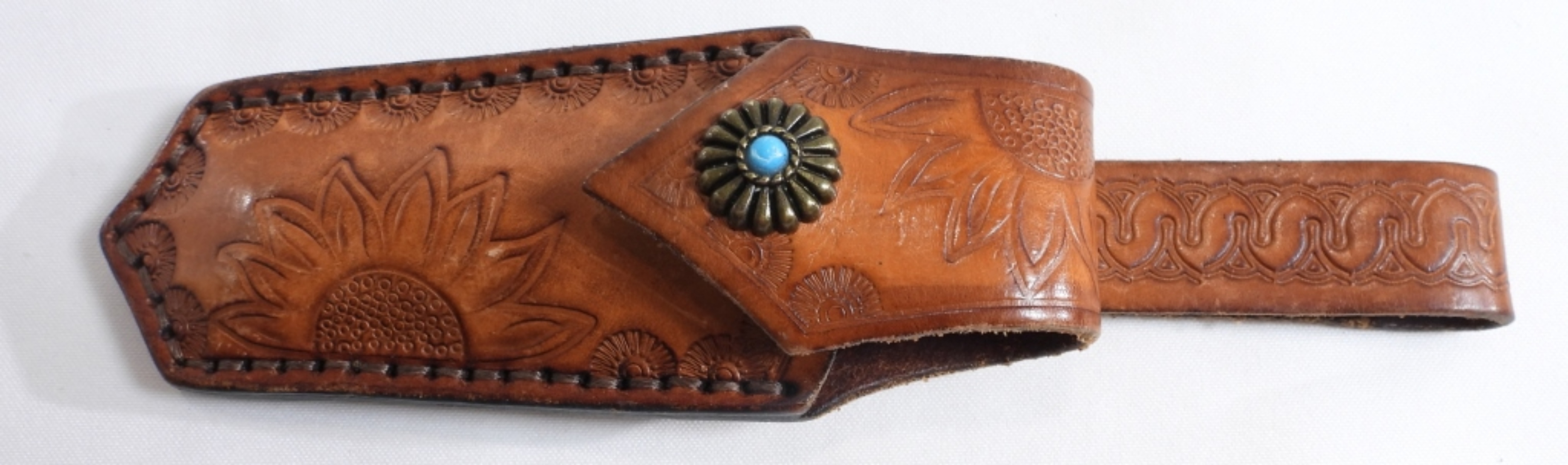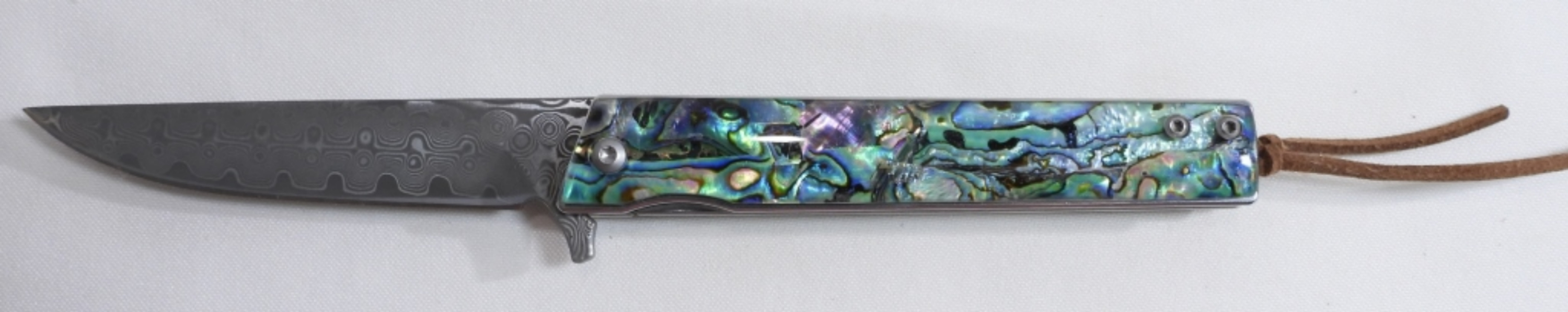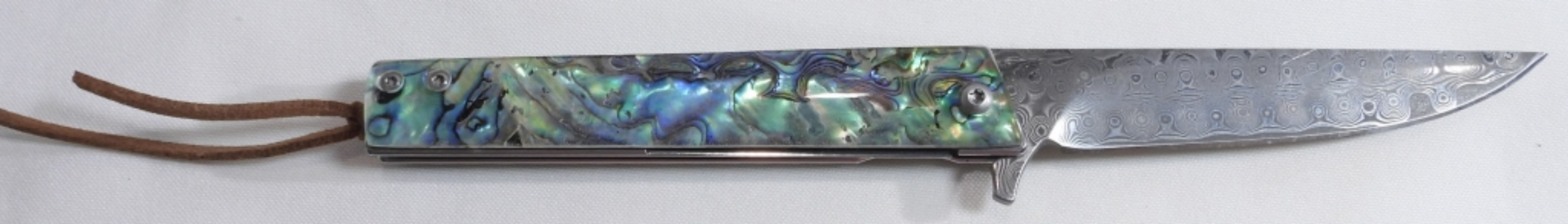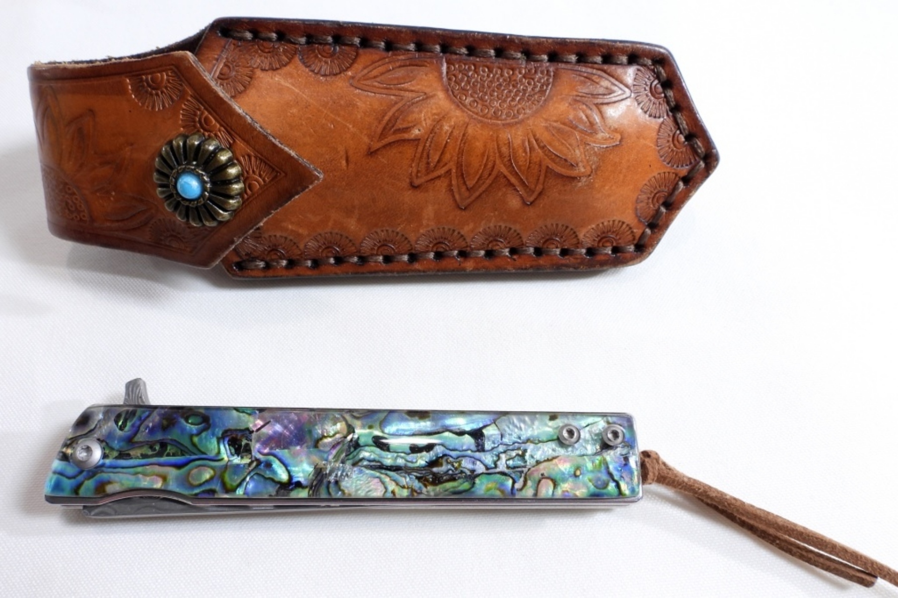 Hand forged with leather sheath. 3-3/4 in blade pocket knife. Has Abalone Handle