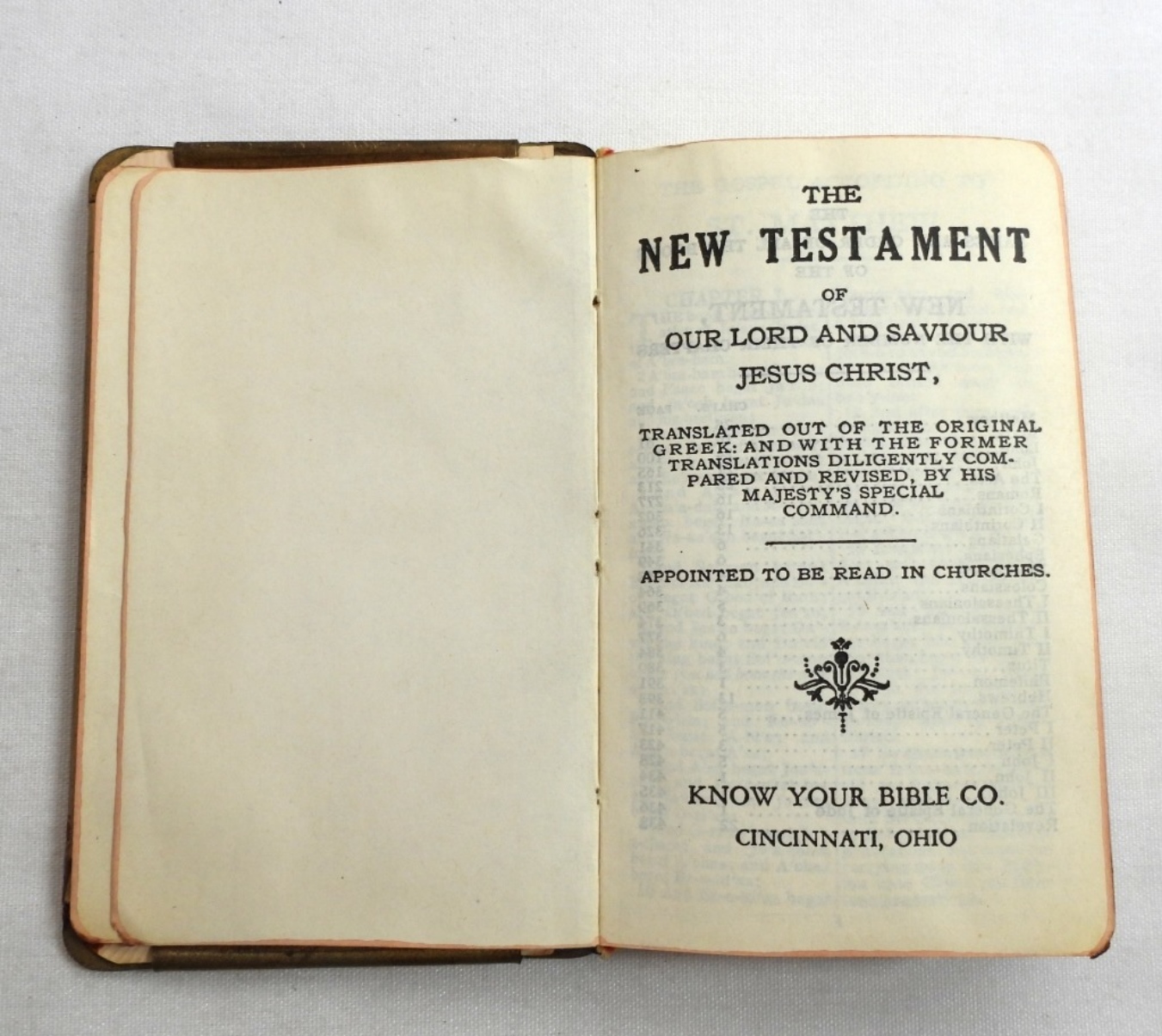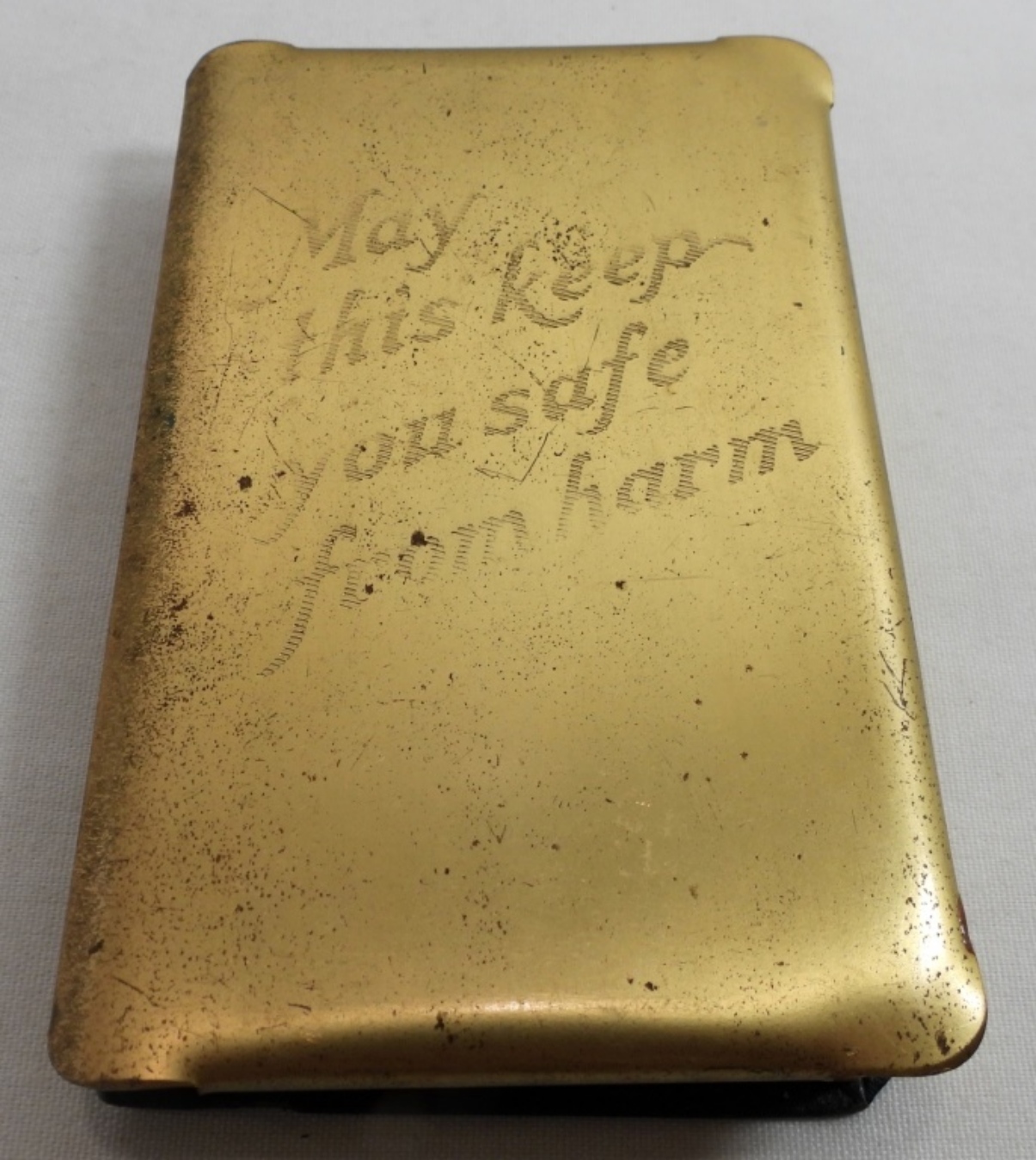 1943 Know your bible co., The heart-shield bible, Engraved gold finished steel front cover Protects the heart ” MAY THIS KEEP YOU SAFE FROM HARM”
