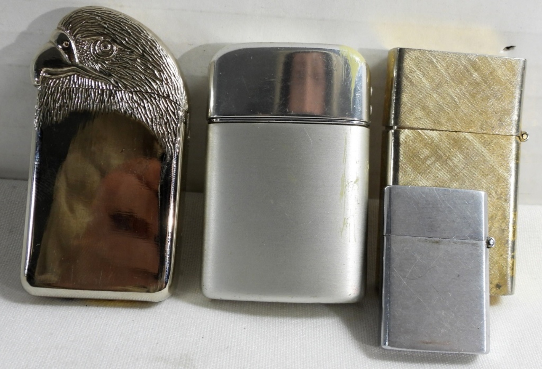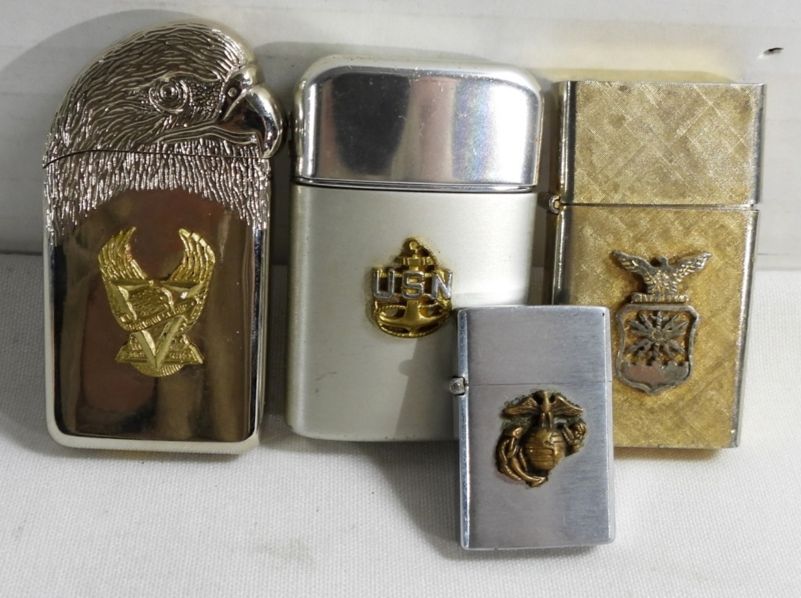 All fired, 1- Florentine brand lighter 14k gold plated featuring a raised emblem of an eagle head, 1- Ranson typhoon lighter US Navy, 1- Marine Corps mini lighter