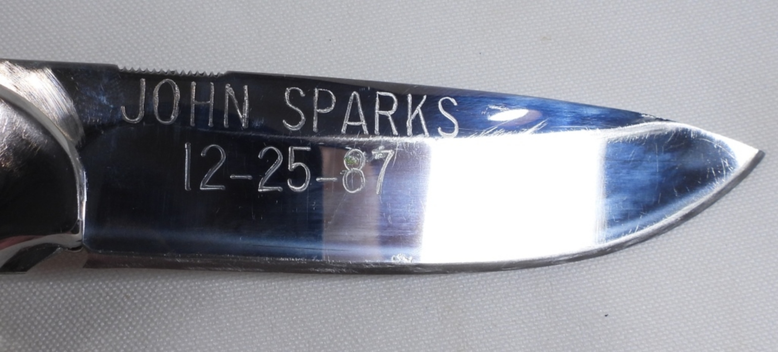 Stag handle with brown leather sheath inscribed CMC 1 of 14/reverse side (John Sparks 12-25-87