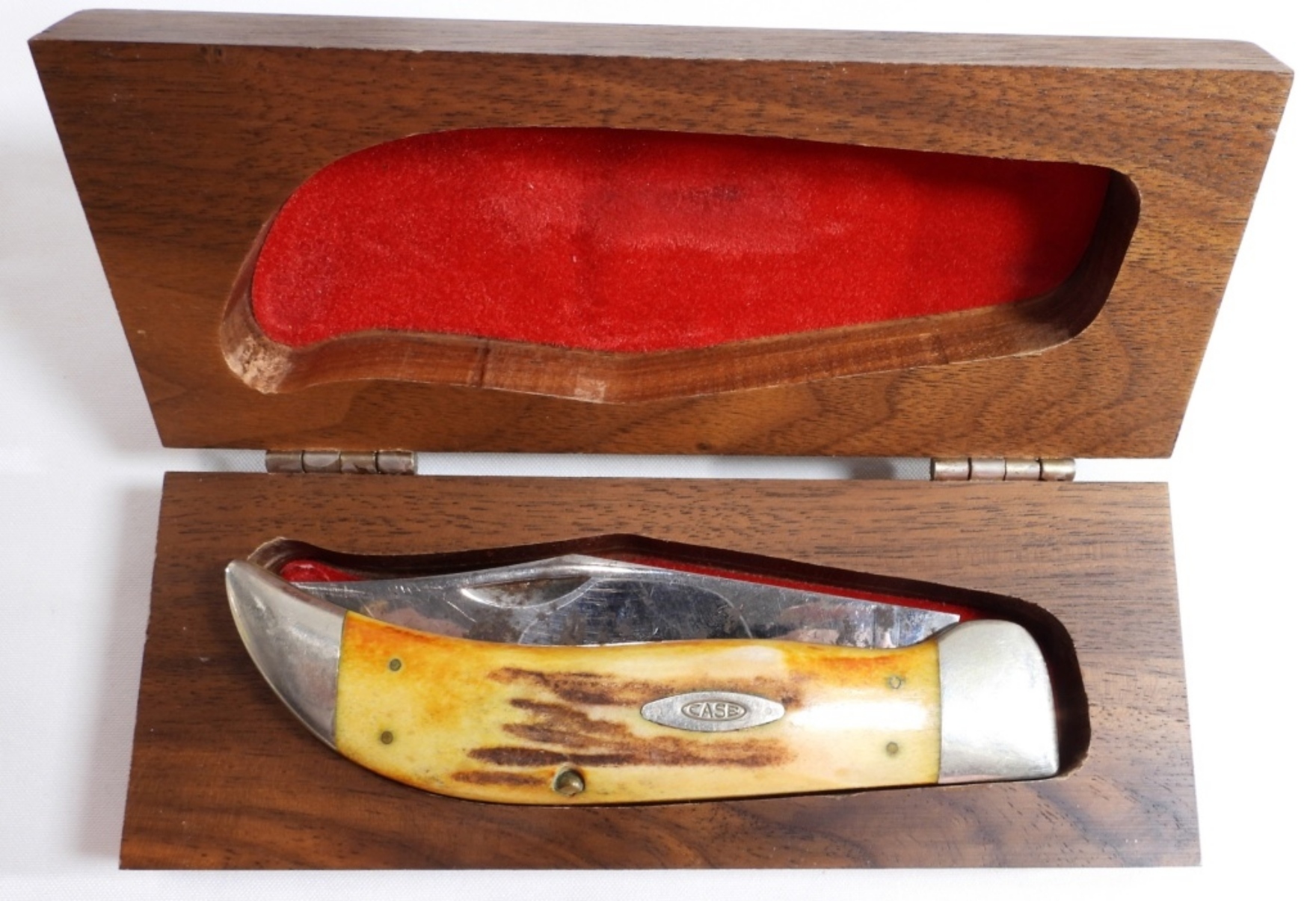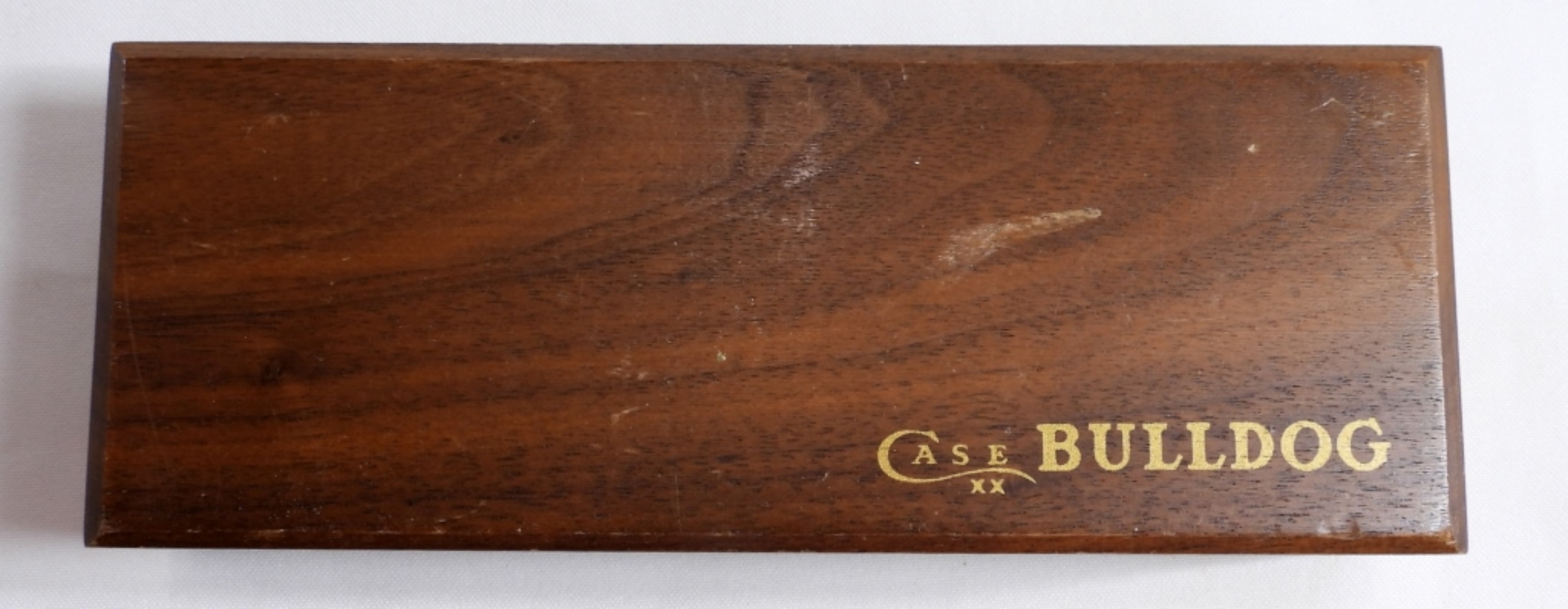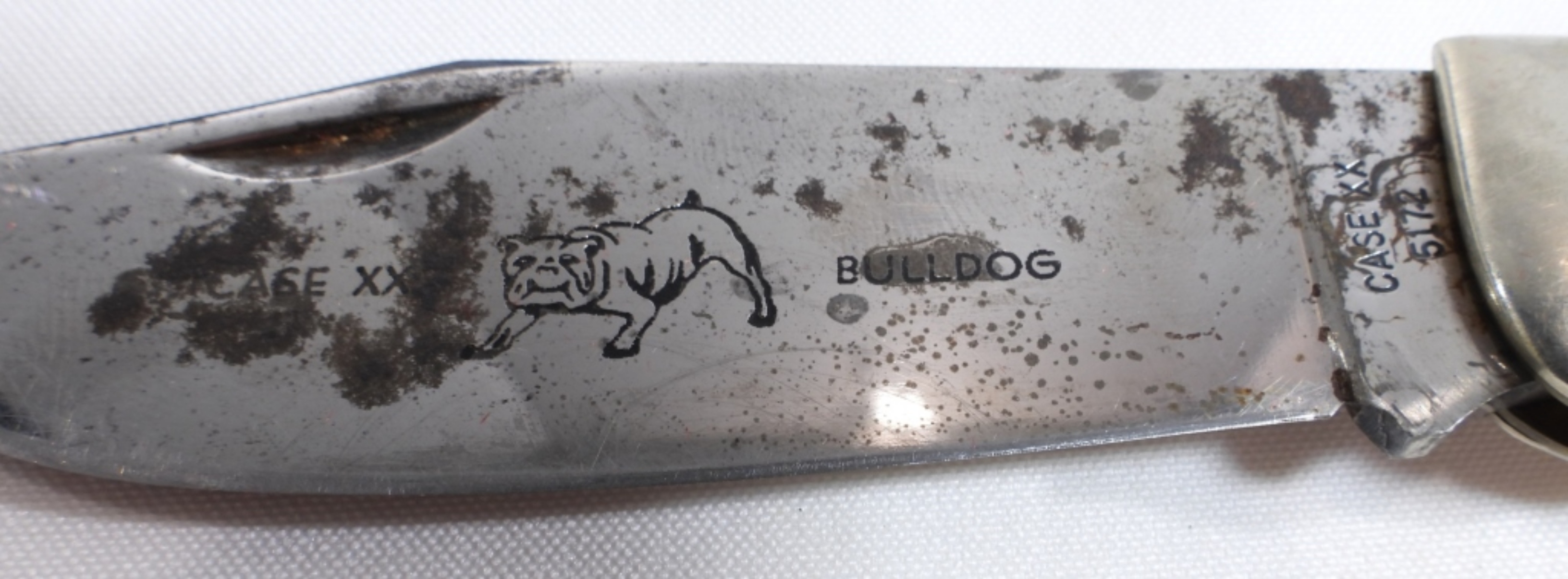 The blade is rusted. #5174 Etched with the Case XX bulldog logo on the blade. Comes in a red velvet-lined wooden box.