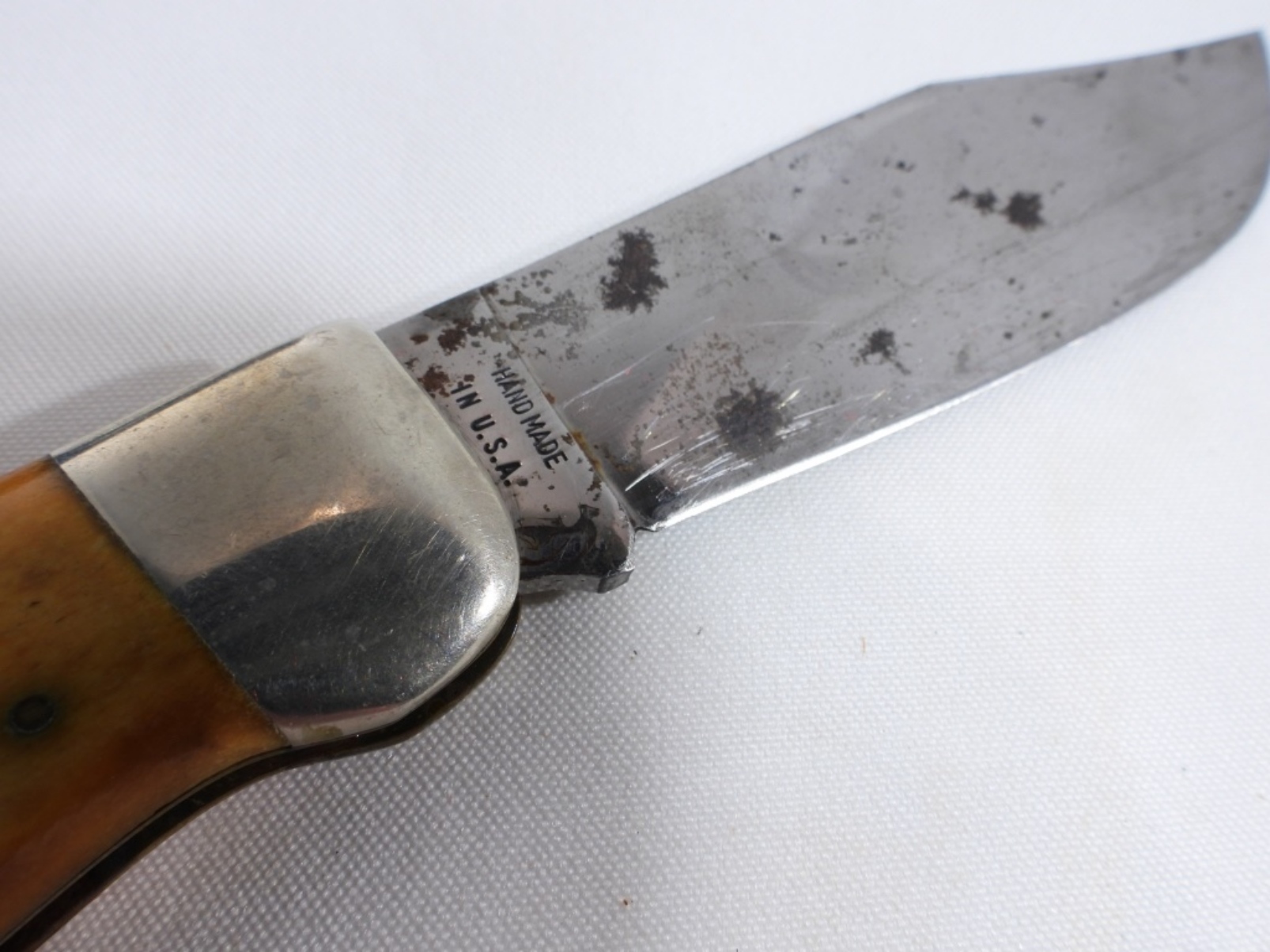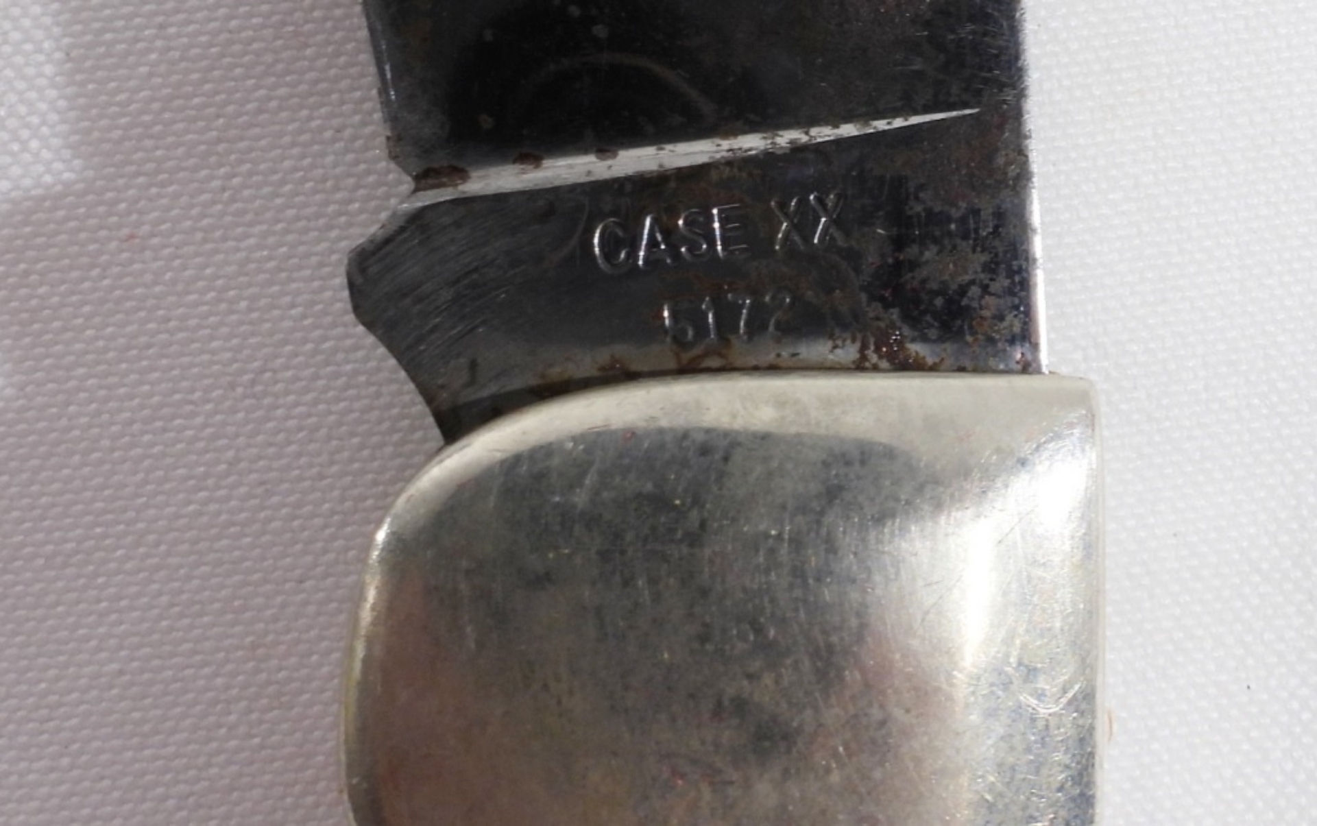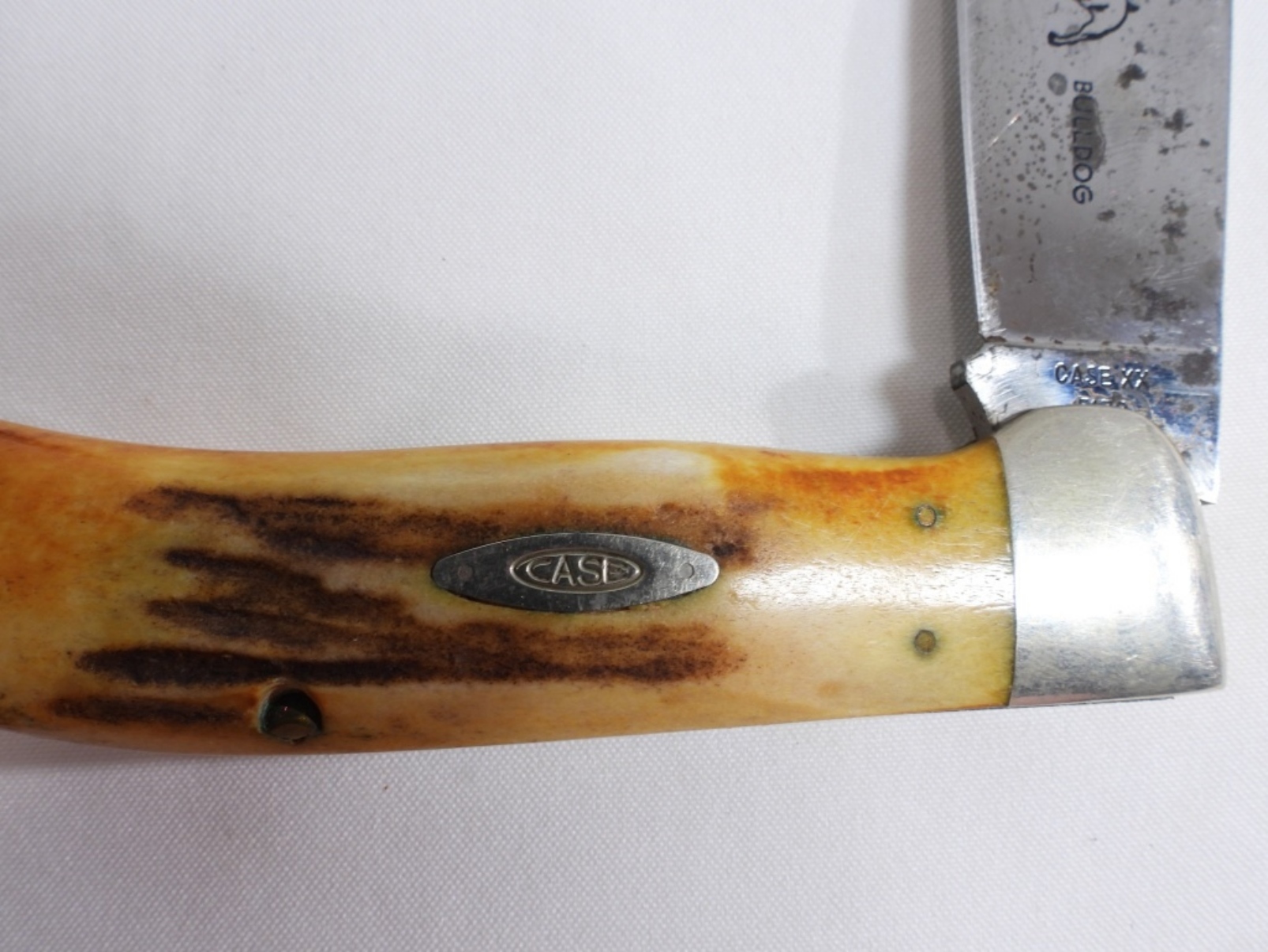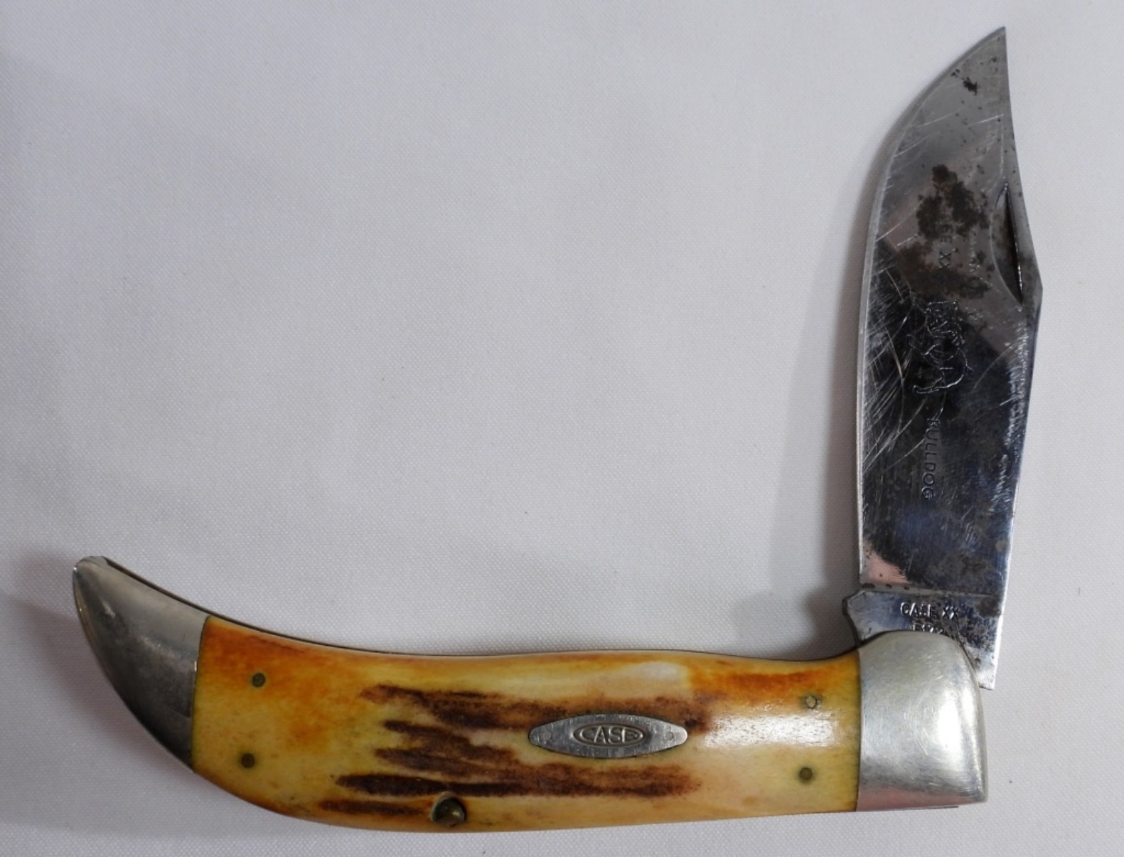 The blade is rusted. #5174 Etched with the Case XX bulldog logo on the blade. Comes in a red velvet-lined wooden box.