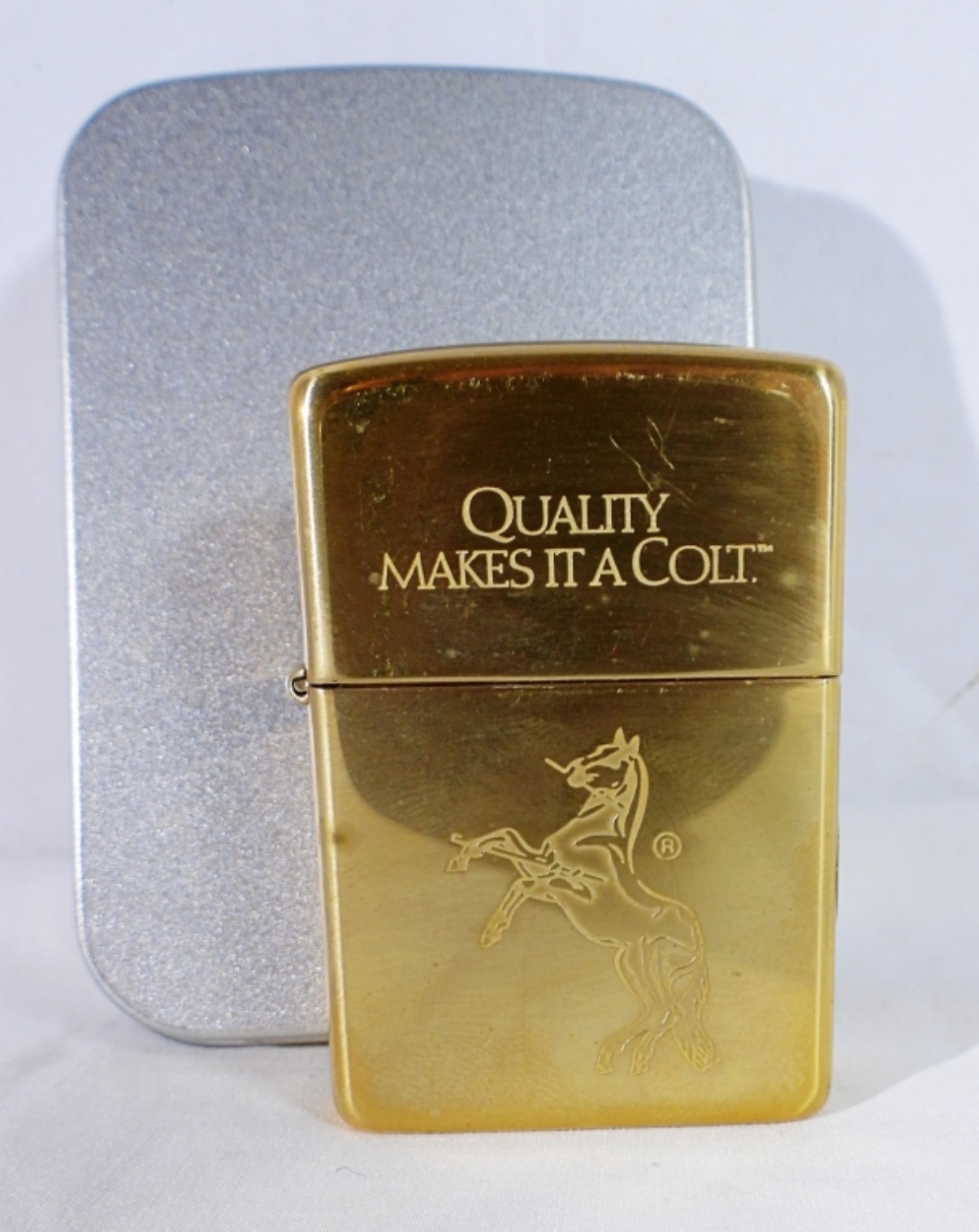 Sealed, in a Zippo box, 1996. Etched ” Quality Makes It A Colt” with horse. Brass case