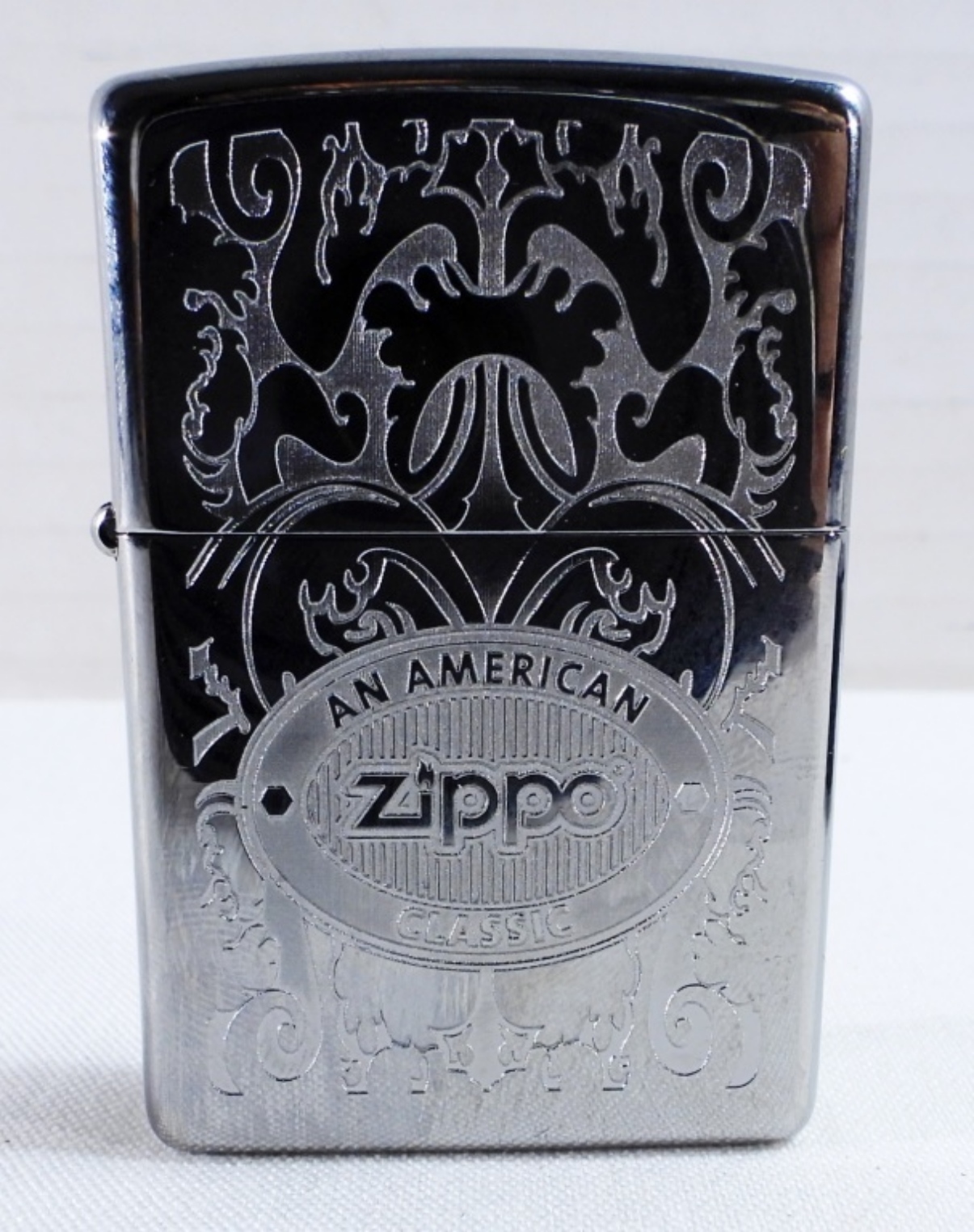 In a box and sealed. Etched design with Zippo on the front.
