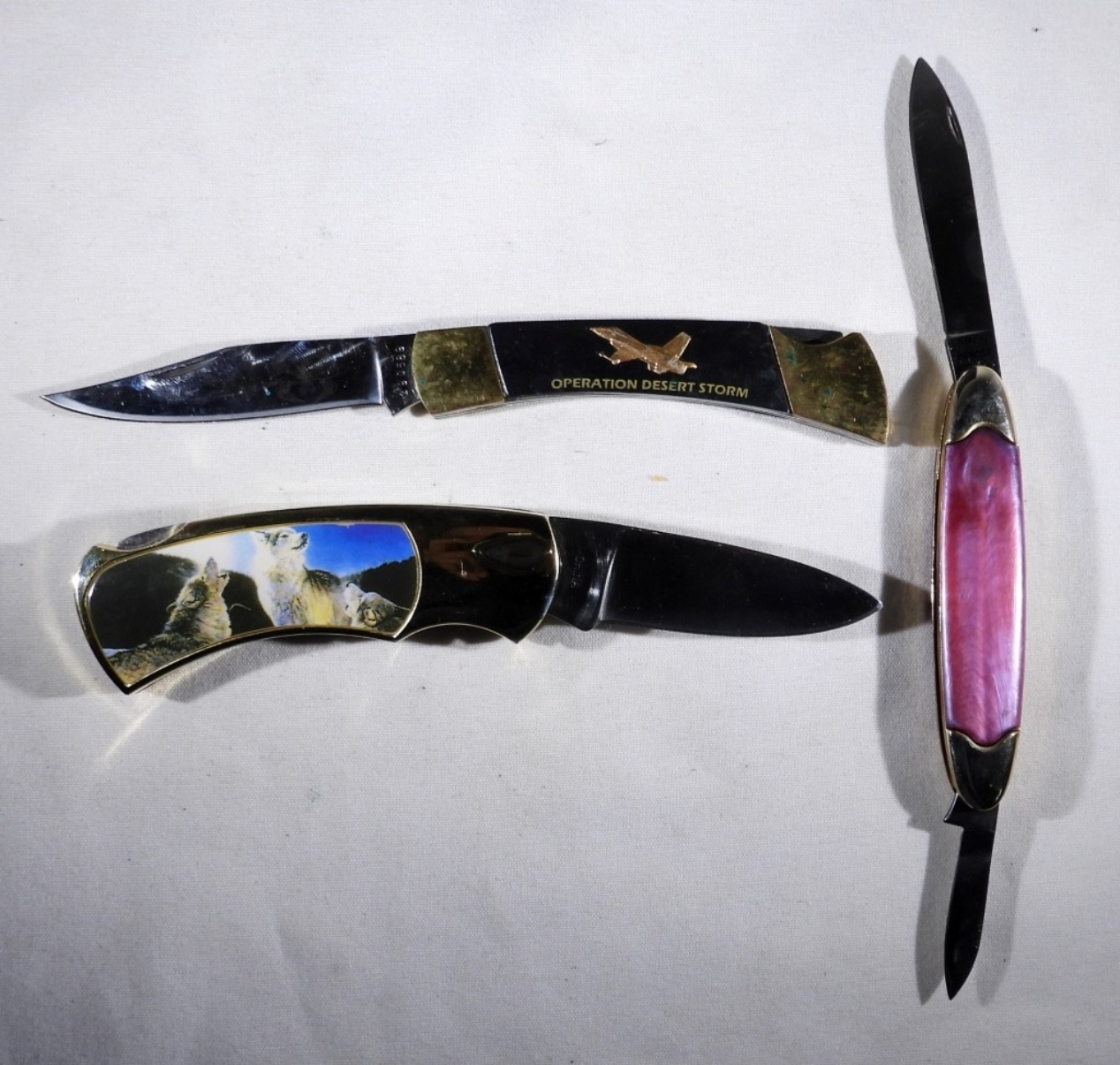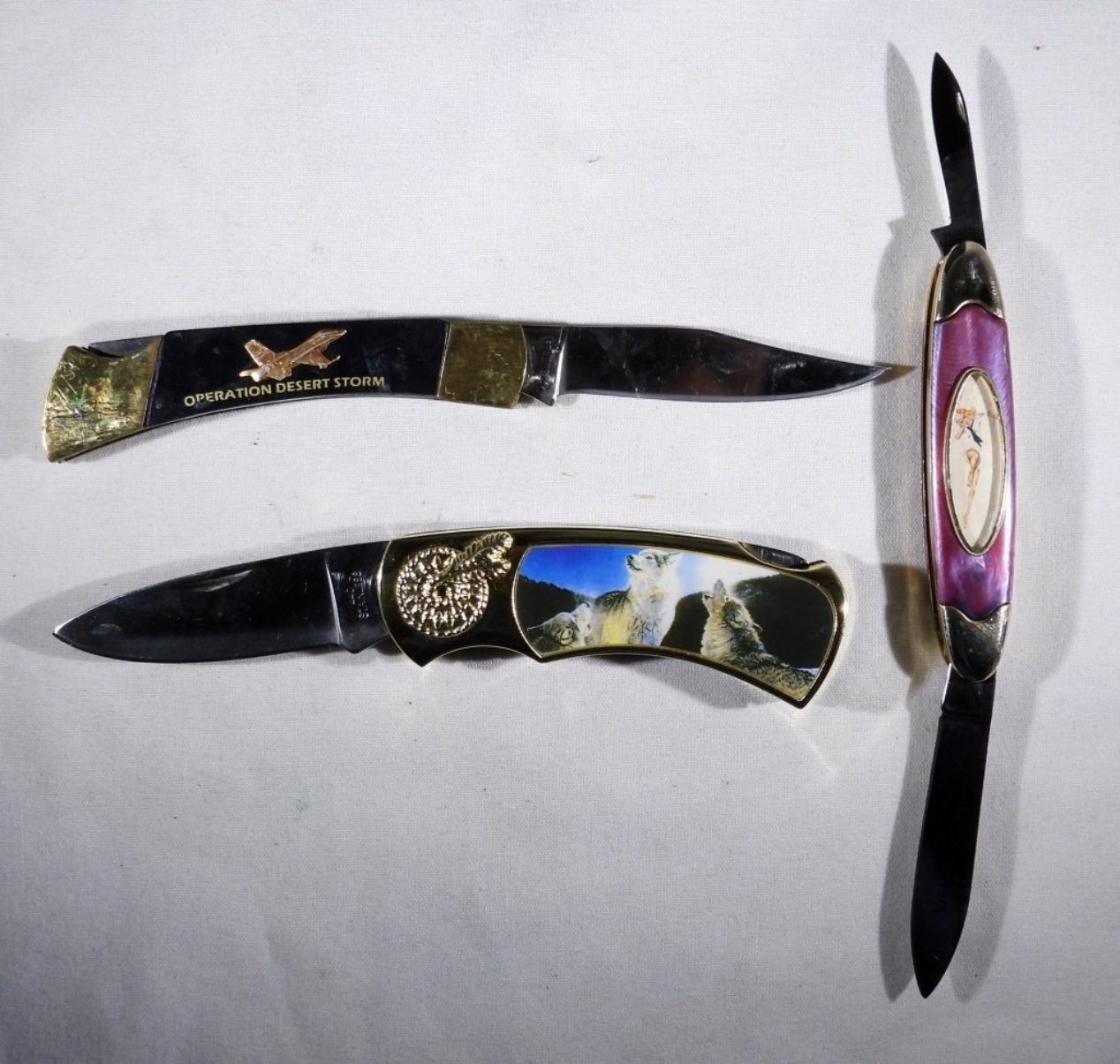Wolf theme knife in a case, Operation Desert Storm, Varga Girl, all nice condition