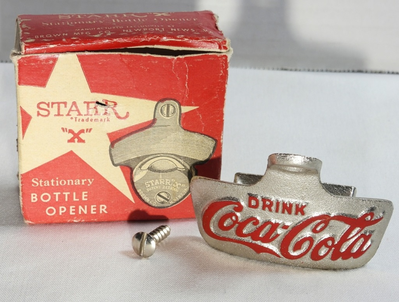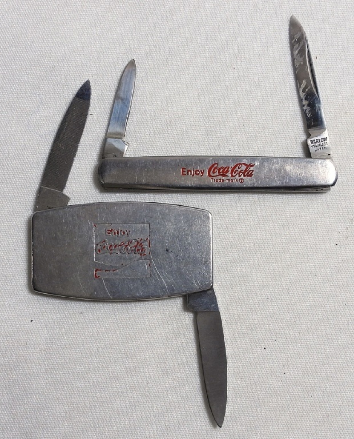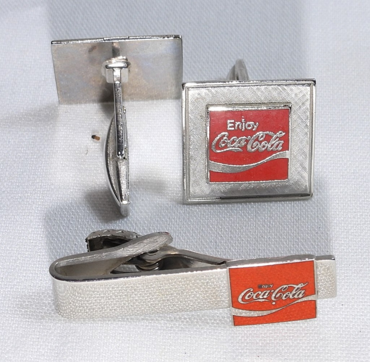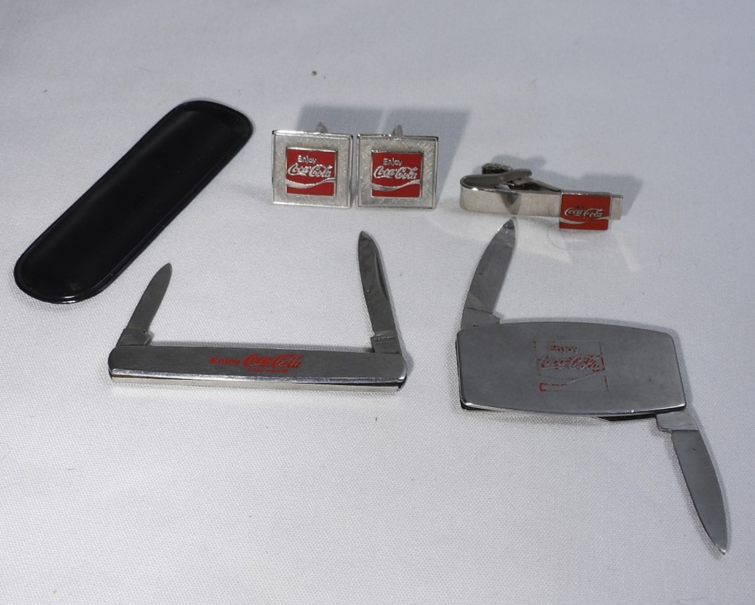 Coca-Cola Stationary Bottle Opener with Original Box. Coca Cola Cufflinks & Tie Clip. Two Coca Cola Pocket Knives.