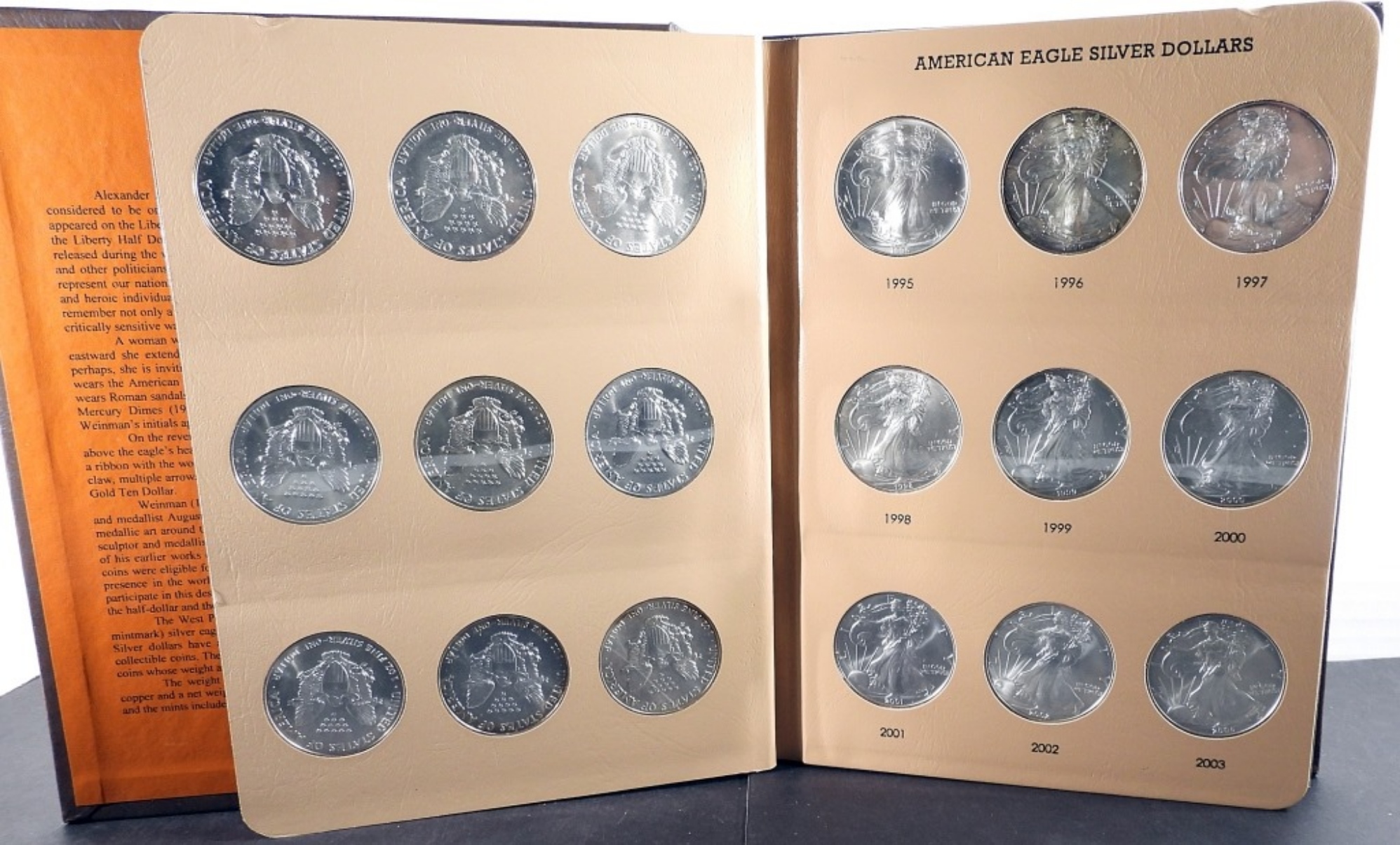 36 American Eagle Silver Dollars in a book. Four pages, Nine coins each page.