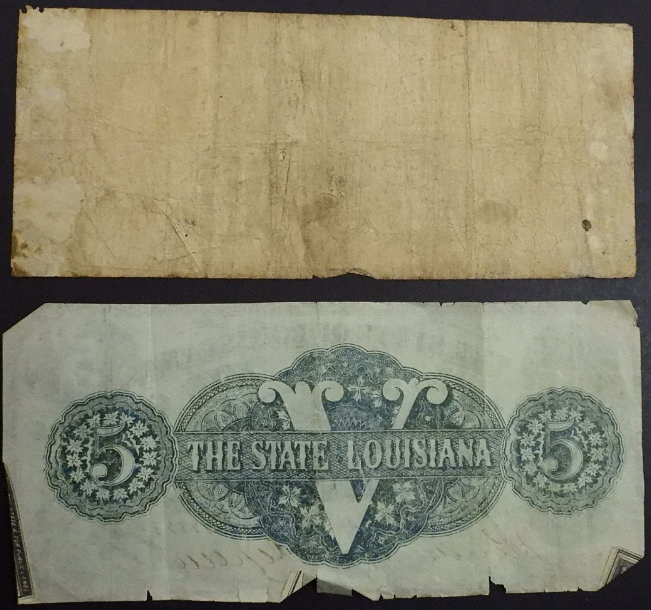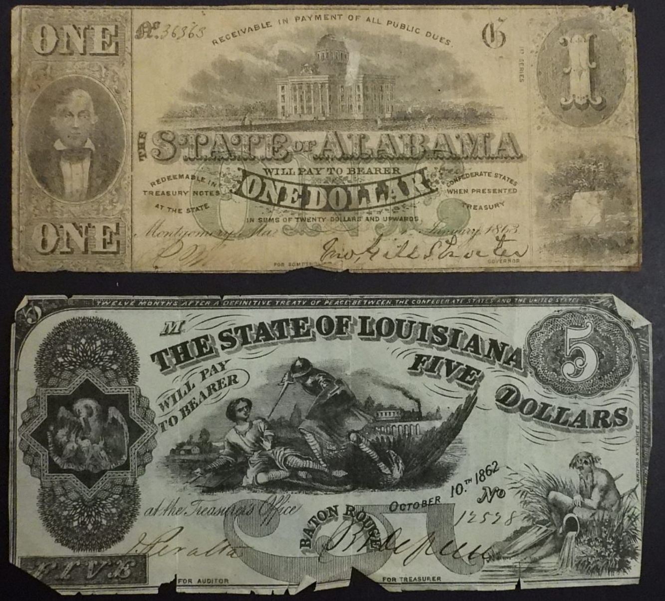 The State of Alabama One Dollar Bill, January 1863, No. 36363. “G 1st Series”. The State of Louisiana Five Dollar Bill, Oct 10 1862, No. 12528, Baton Rouge. “M”.
