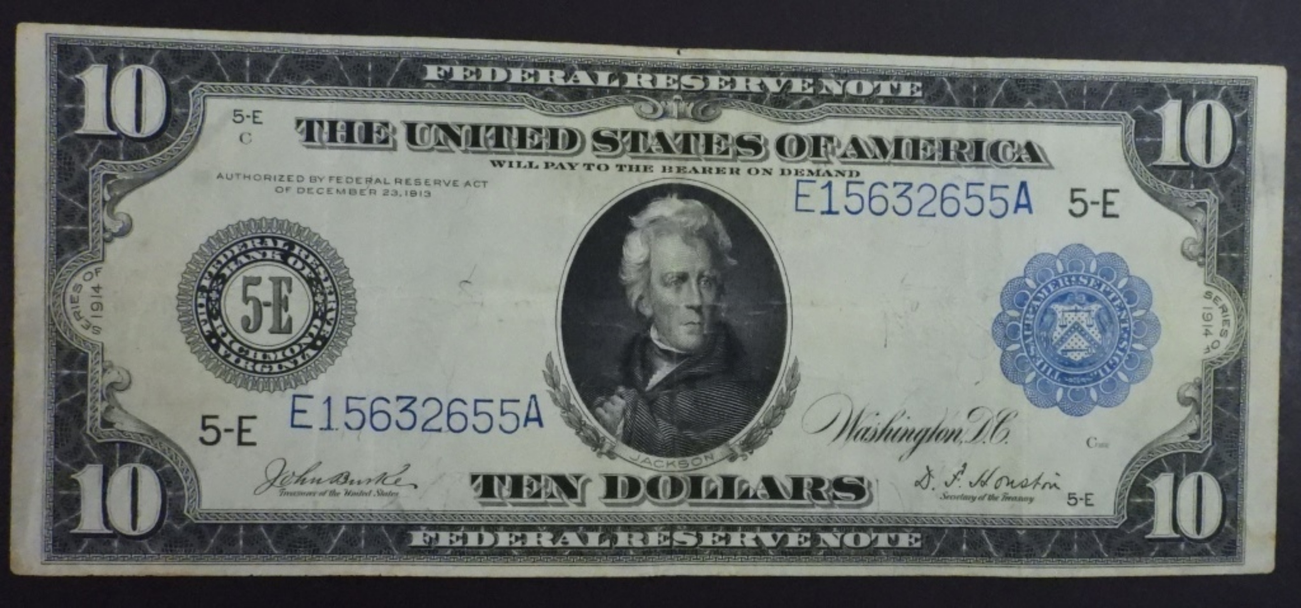 Series 1914 $10 Federal Reserve Note, 5-E. Serial # E15632655A Large bill