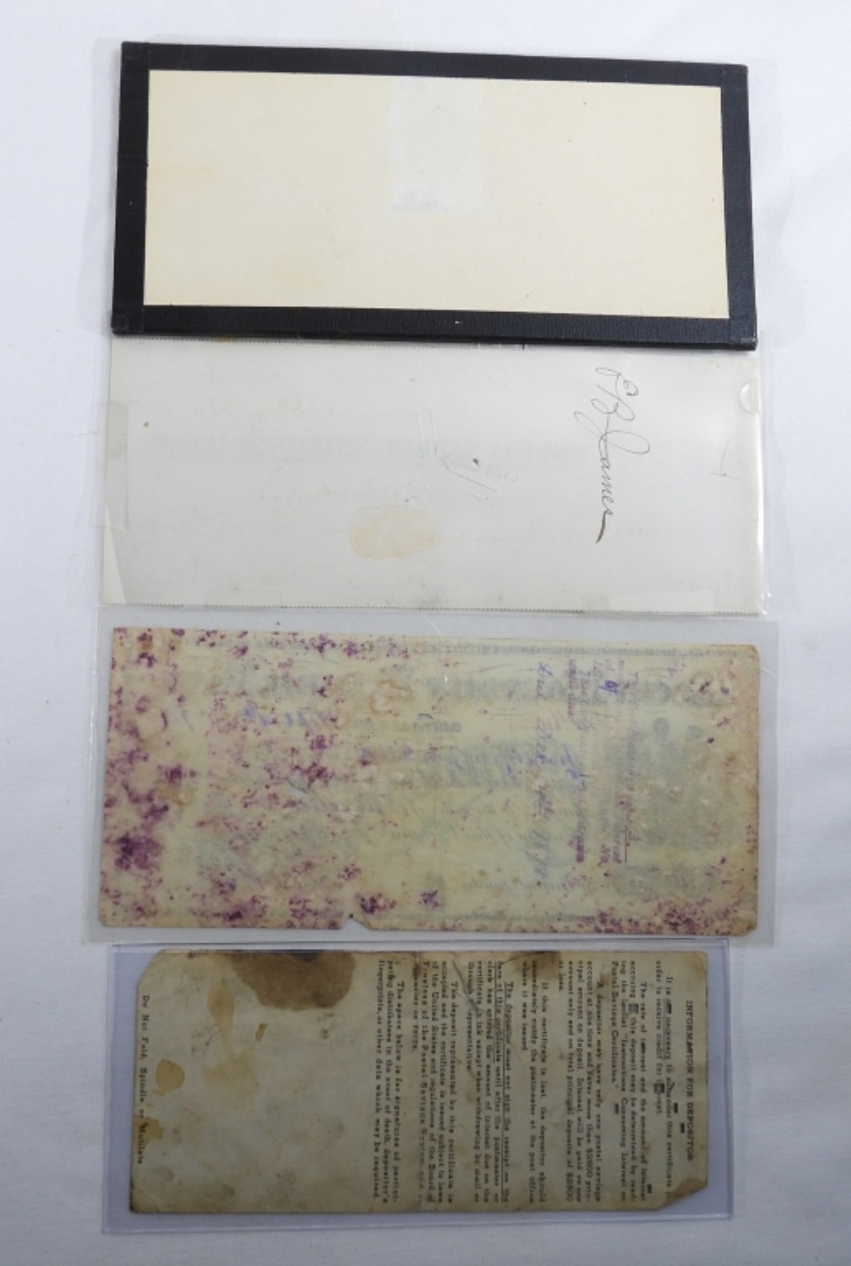 Rocky Mountain National Bank COD – 1878. Postal Savings System $5 – 1960. Westcott Chuck Company check – 1892. Framed Manistee & North Eastern Railroad Company check – no year.