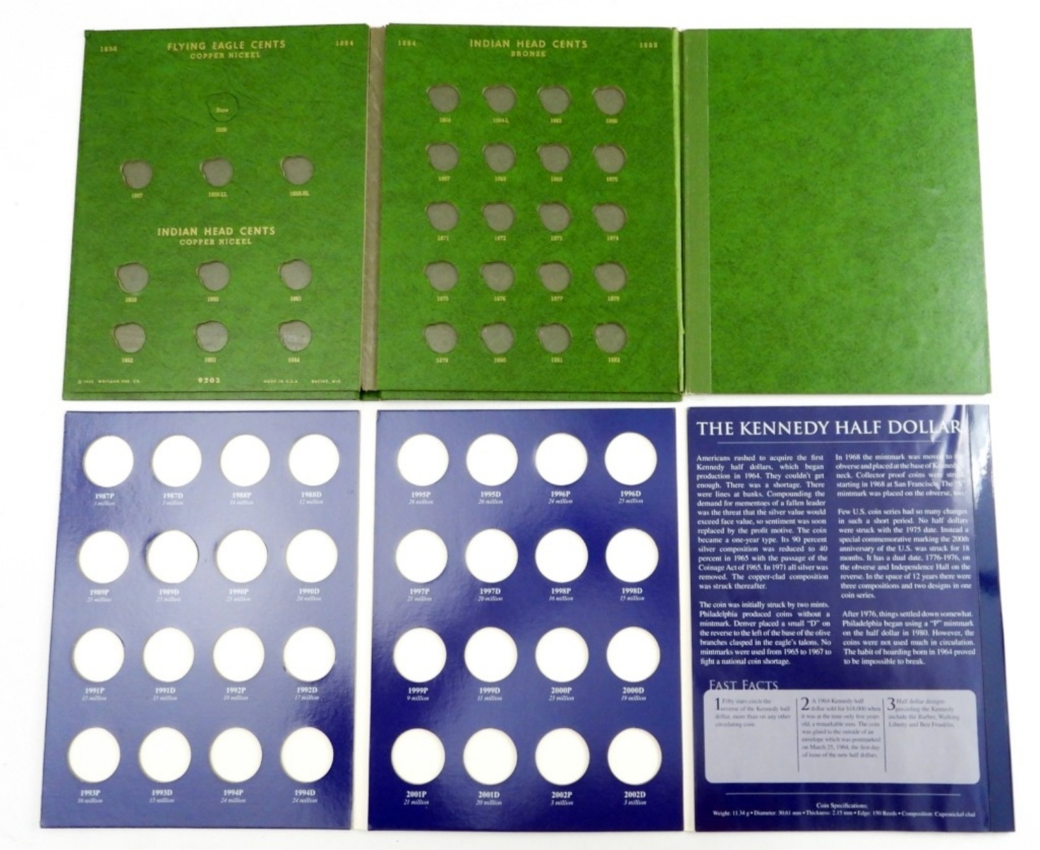 Dansco Coin Stock Book, Whitman Flying Eagle-Indian Cents, H.E. Harris & Co. Washington Quarters 1932-1948, Treat Half Dollar 1948-1979+, & Warmans Kennedy Half Dollars 1987-2008