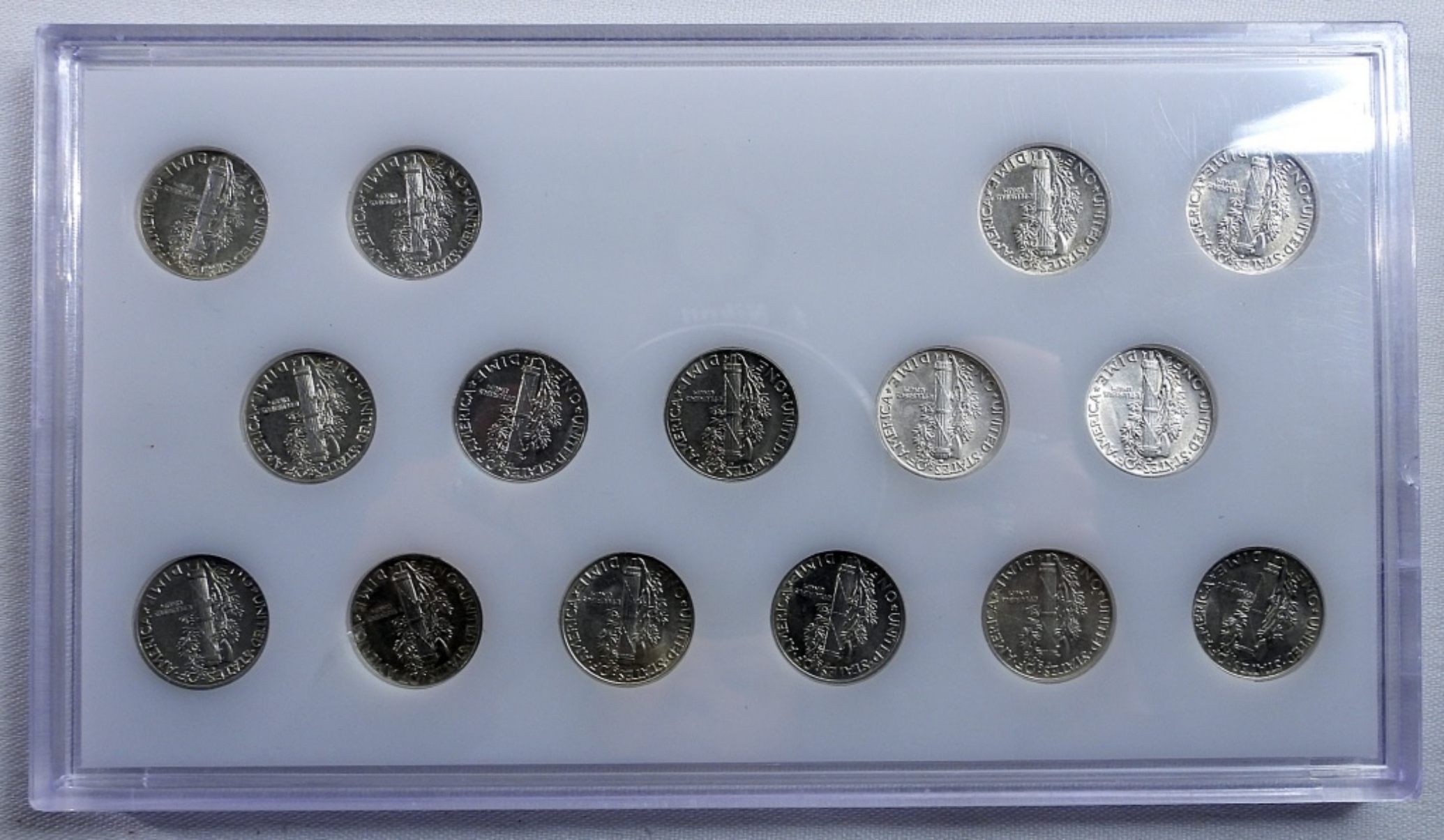 Fifteen United States Mercury Dimes in a Collectors Case. 1941-1945.